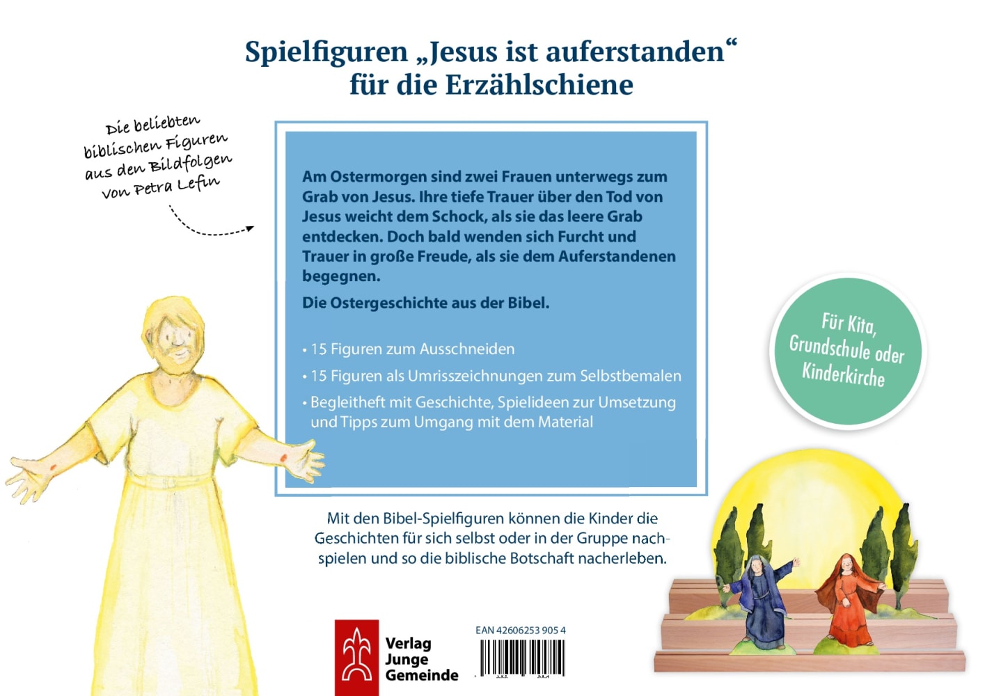 Am Ostermorgen gehen zwei Frauen voller Trauer zum Grab Jesu. Doch das Grab ist leer. Da begegnet ihnen ein unbekannter Mann und sie erkennen in ihm den Auferstandenen ... (nach Matthäus 28,1-10). Information zur Reihe: Die Kinderbibelgeschichten von Petra Lefin sind in der Gemeinde- und Religionspädagogik zu einem echten Klassiker geworden. Die biblischen Figuren aus den Bildfolgen für das Kamishibai und den Bilderbüchern gibt es jetzt auch als Spielfiguren für die Erzählschiene. Jedes Set umfasst 10 bis 15 Figuren zum Ausschneiden. Zusätzlich gibt es alle Figuren als Umrisszeichnungen zum Selbstbemalen. Im Begleitheft finden sich die vollständige Geschichte, Spielideen zur Umsetzung und Tipps zum Umgang mit dem Material.