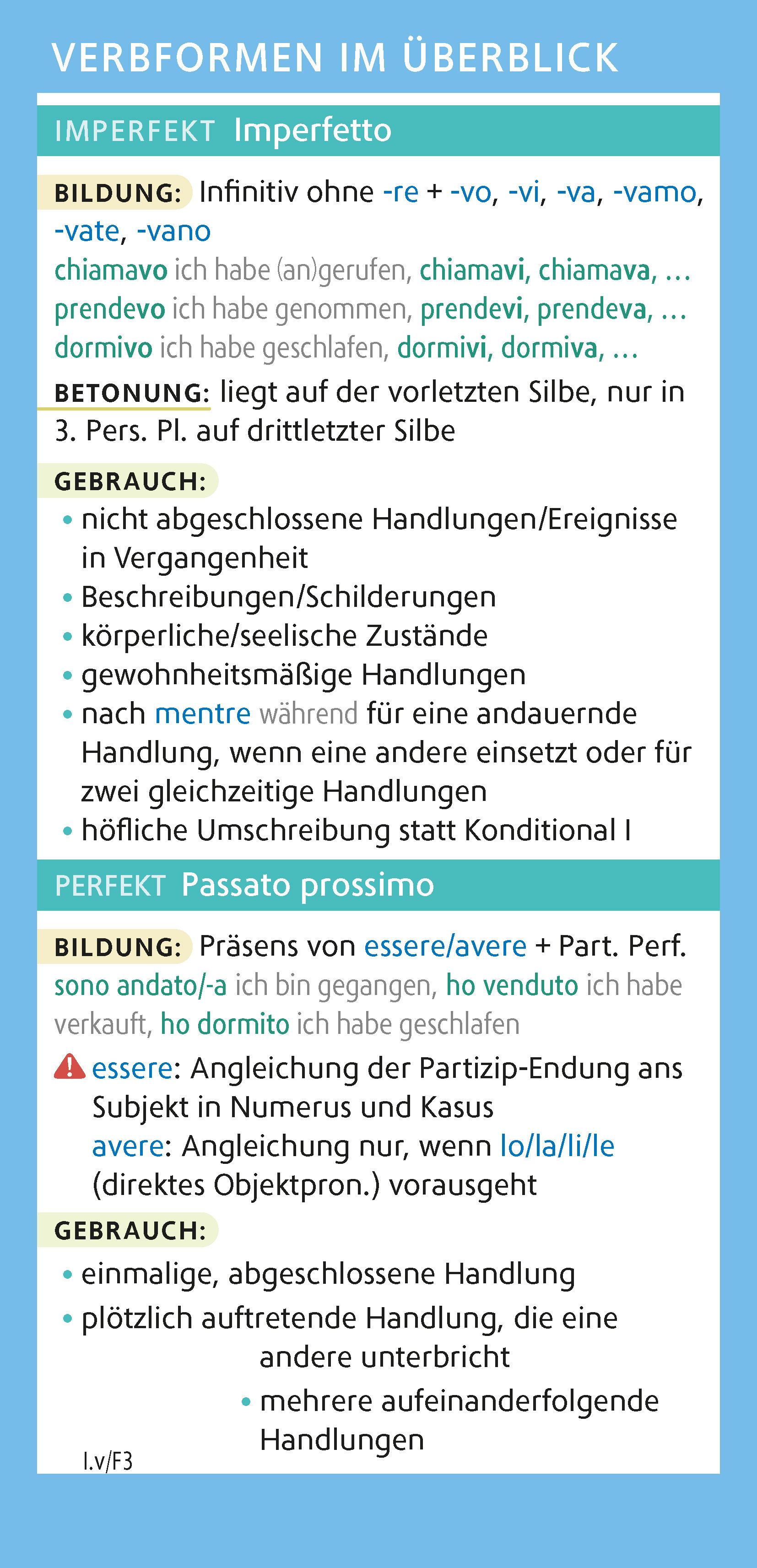 | Schlagworte | auf einen Blick • Italienisch lernen • Italienisch Zeiten • Konjugation italienisch • lernhilfe italienisch • Schule • unregelmäßige Verben • unregelmäßige verben italienisch • Verben • Verben für die Schule • Verben unterwegs • Verbtabelle italienisch |