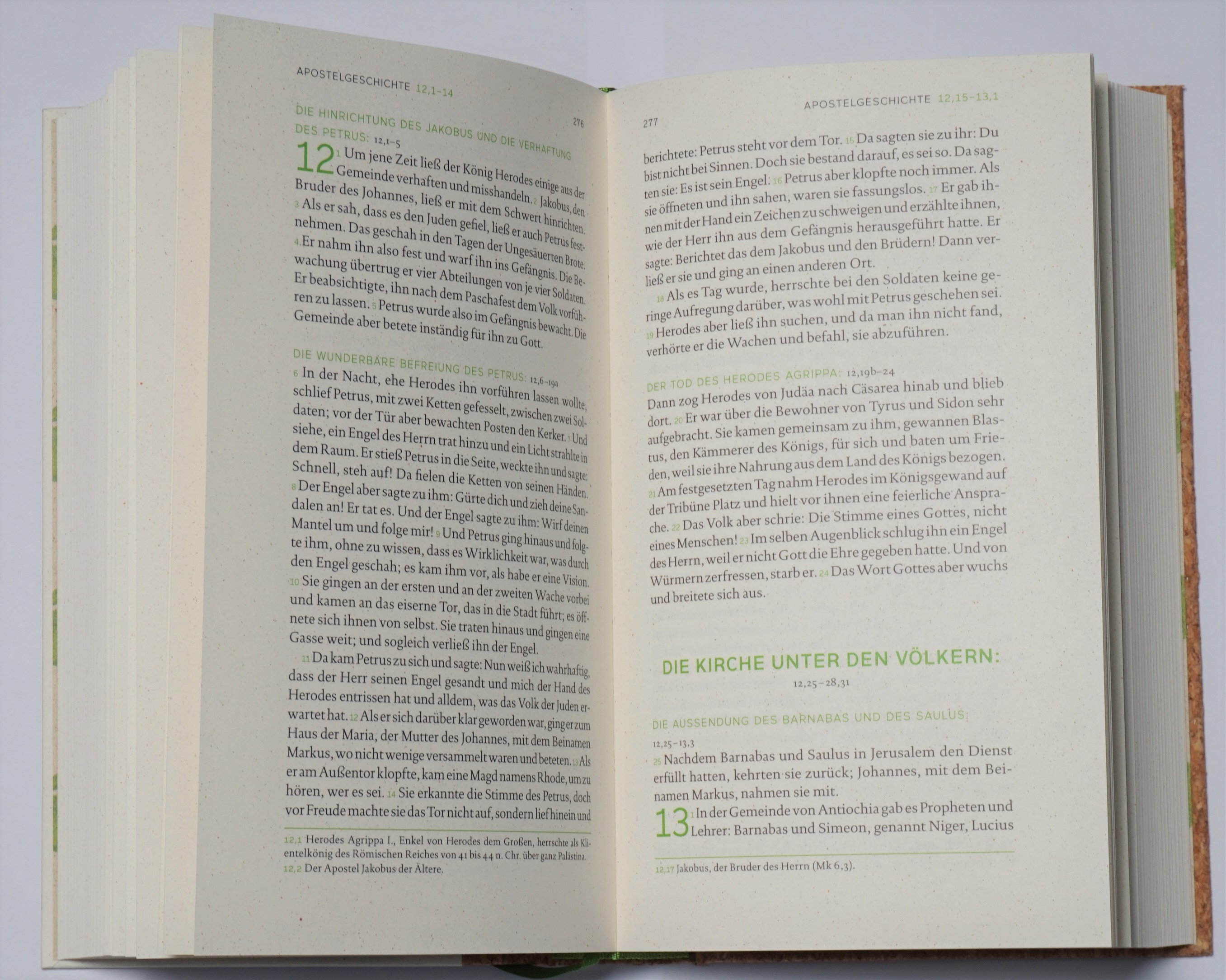 Die umweltfreundliche und nachhaltige Alternative:Diese Ausgabe des Neuen Testaments in der Einheitsübersetzung überzeugt nicht nur durch den Handschmeichler-Einband aus Naturkork, den übersichtlichen zweifarbigen (grün und schwarz) und einspaltigen Satz, sondern vor allem auch durch die komplett umweltfreundliche Produktion aus Naturmaterialien.Gedruckt wurde die Teilausgabe der Bibel auf Apfelpapier aus Südtirol, das aus den Resten der Apfelsaftproduktion (Trester) hergestellt wird. Bei Druckfarbe und Leim handelt es sich um unbedenkliche Substanzen. Diese Ausgabe wurde in Deutschland produziert, zu allen Materialien liegen Zertifikate vor.