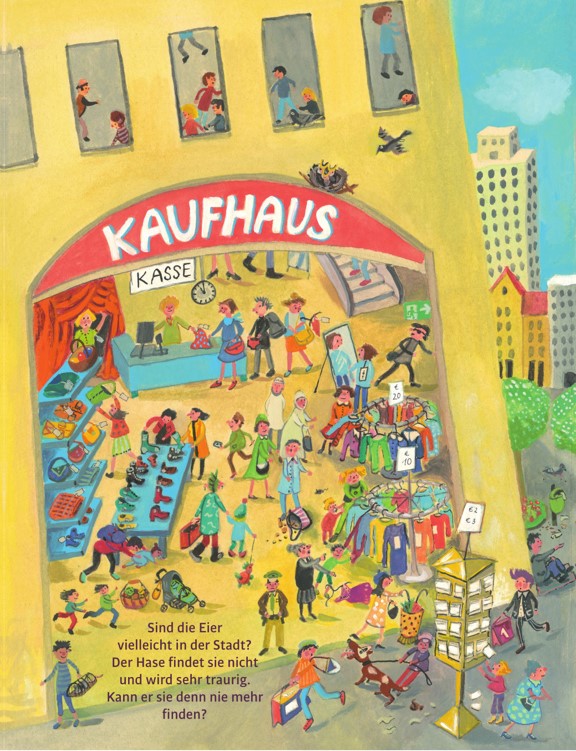 Eine Osterwimmelgeschichte vom Verlieren und Wiederfinden: Auf dem Bauernhof und dem Abenteuerspielplatz, im Wald, im Dorf, in der Stadt und sogar in der Kirche - da wimmelt es überall von lustigen Kindern. Mittendrin ein Hase, der ständig auf der Suche nach bunten Eiern ist. Fast hat er die Hoffnung schon aufgegeben. Aber was sieht er da im Schein des Osterfeuers?
