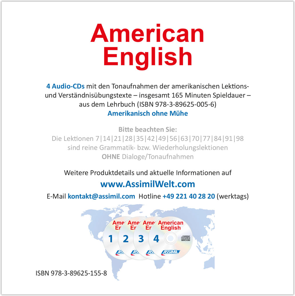 Die Audio-CDs (165 Minuten Spieldauer) enthalten die amerikanischen Tonaufnahmen (Lektionstexte und Verständnisübungen) passend zum Lehrbuch "Amerikanisch ohne Mühe". Die Aufnahmen wurden ausschließlich mit Muttersprachlern (allesamt professionelle Sprecherinnen und Sprecher) produziert. Die Sprechgeschwindigkeit ist dem jeweiligen Lektionsniveau angepasst.