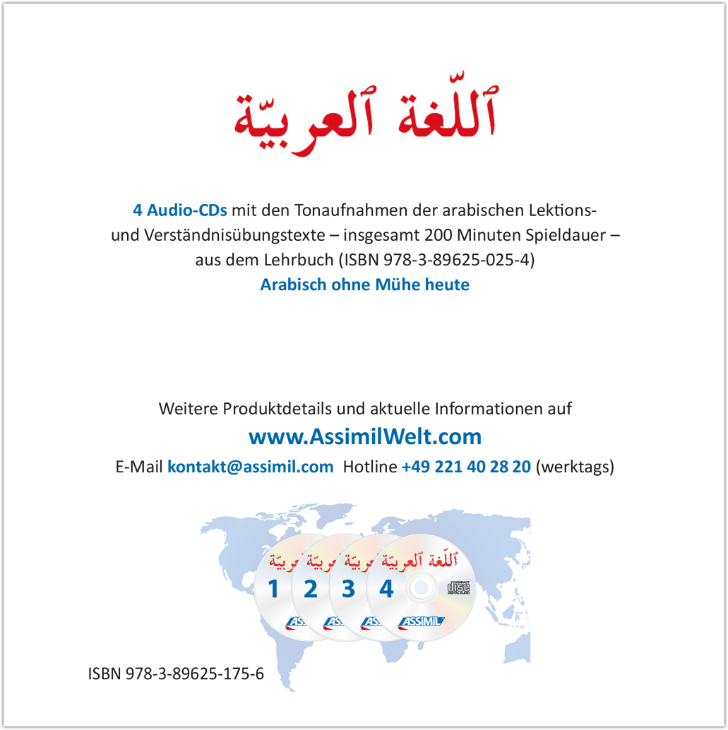 Die Audio-CDs (200 Minuten Spieldauer) enthalten die arabischen Tonaufnahmen (Lektionstexte und Verständnisübungen) passend zum Lehrbuch "Arabisch ohne Mühe heute". Die Aufnahmen wurden ausschließlich mit Muttersprachlern (allesamt professionelle Sprecherinnen und Sprecher) produziert. Die Sprechgeschwindigkeit ist dem jeweiligen Lektionsniveau angepasst.