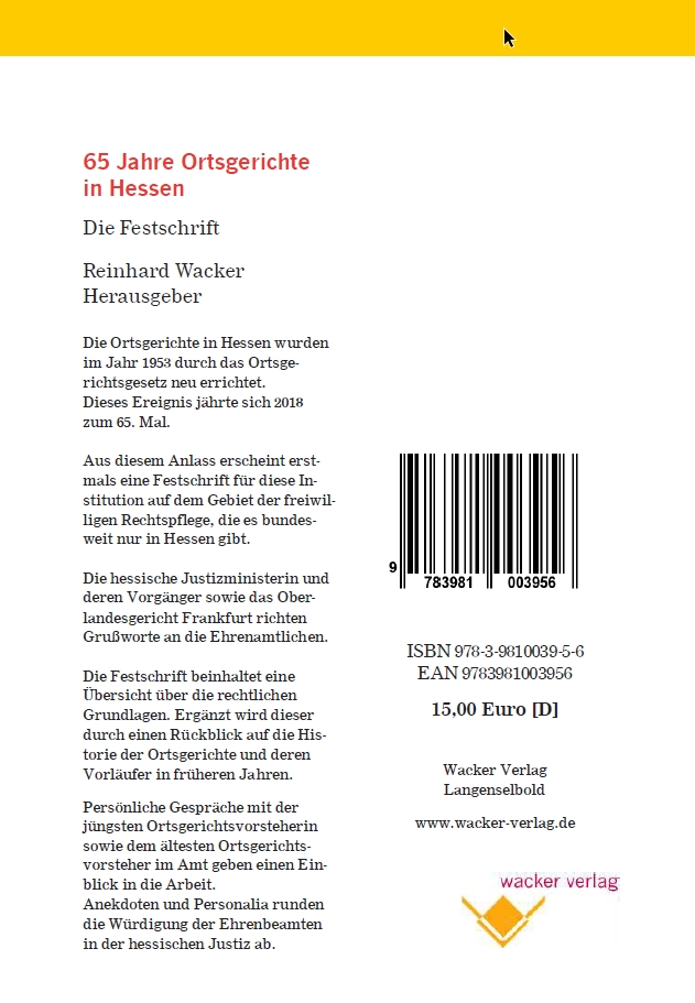 | Schlagworte | Dienstanweisung • Festschrift • Hessen • Hessenrecht • Ortsgericht • Ortsgerichtsgesetz |