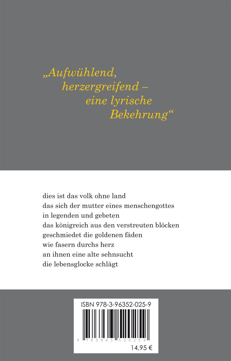 dies ist das volk ohne landdas sich der mutter eines menschengottesin legenden und gebetendas königreich aus den verstreuten blöckengeschmiedet die goldenen fädenwie fasern durchs herzan ihnen eine alte sehnsuchtdie lebensglocke schlägt"Aufwühlend, herzergreifend - eine lyrische Bekehrung"
