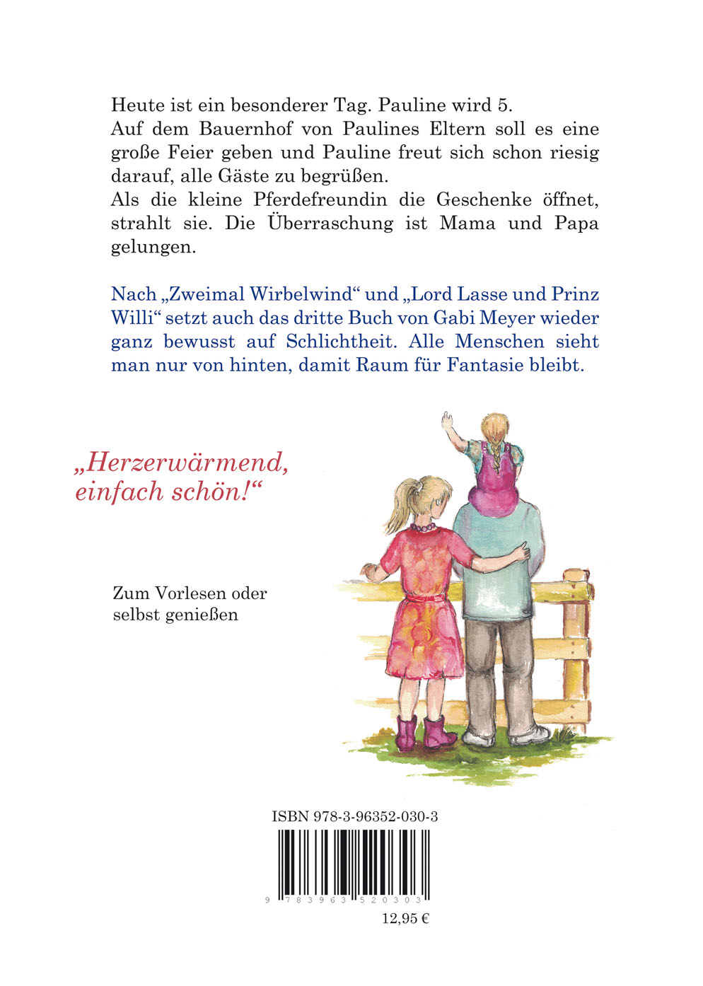 Nach "Zweimal Wirbelwind" und "Lord Lasse und Prinz Willi" setzt auch das dritte Buch von Gabi Meyer wieder ganz bewusst auf Schlichtheit. Alle Menschen sieht man nur von hinten, damit Raum für Fantasie bleibt.