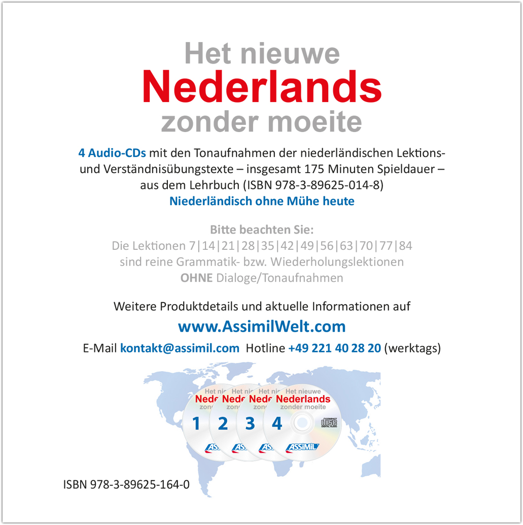 Die Audio-CDs (175 Minuten Spieldauer) enthalten die niederländischen Tonaufnahmen (Lektionstexte und Verständnisübungen) passend zum Lehrbuch "Niederländisch ohne Mühe heute". Die Aufnahmen wurden ausschließlich mit Muttersprachlern (allesamt professionelle Sprecherinnen und Sprecher) produziert. Die Sprechgeschwindigkeit ist dem jeweiligen Lektionsniveau angepasst.