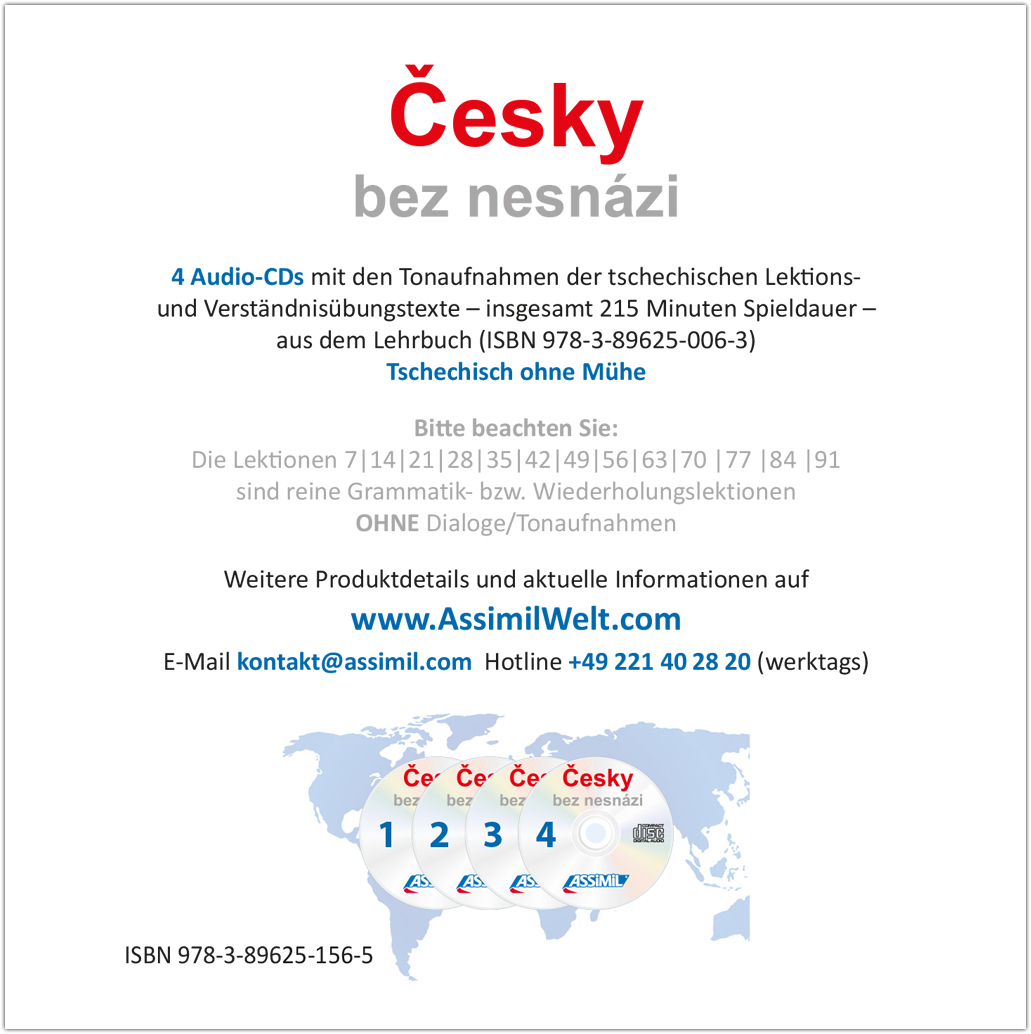 Die Audio-CDs (215 Minuten Spieldauer) enthalten die tschechischen Tonaufnahmen (Lektionstexte und Verständnisübungen) passend zum Lehrbuch "Tschechisch ohne Mühe". Die Aufnahmen wurden ausschließlich mit Muttersprachlern (allesamt professionelle Sprecherinnen und Sprecher) produziert. Die Sprechgeschwindigkeit ist dem jeweiligen Lektionsniveau angepasst.
