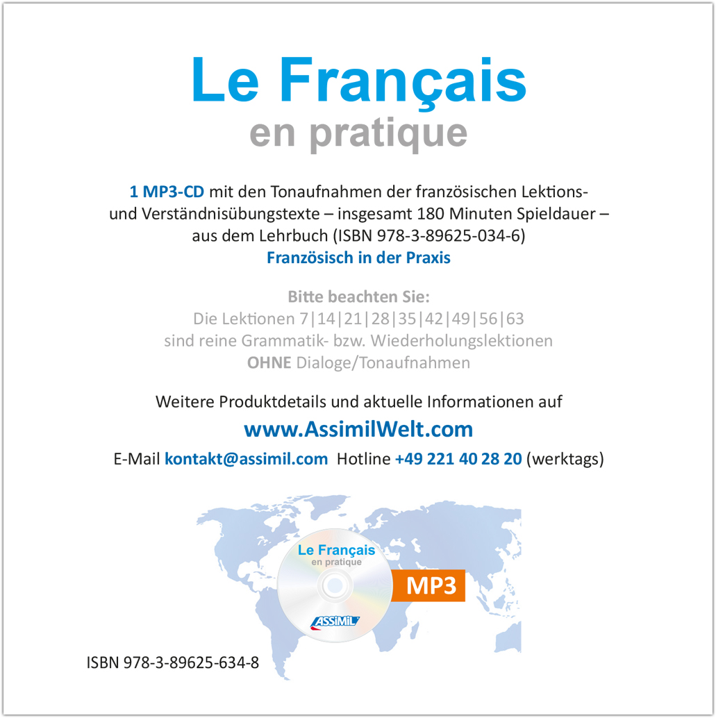 Die MP3-CD (180 Minuten Spieldauer) enthält die französischen Tonaufnahmen (Lektionstexte und Verständnisübungen) passend zum Lehrbuch "Französisch in der Praxis". Die Aufnahmen wurden ausschließlich mit Muttersprachlern (allesamt professionelle Sprecherinnen und Sprecher) produziert. Die MP3-CD bietet zusätzlich eine Textanzeigefunktion bei geeignetem Abspielgerät.
