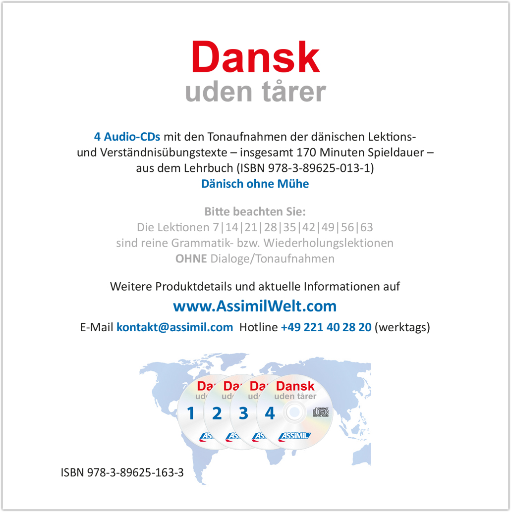Die Audio-CDs (170 Minuten Spieldauer) enthalten die dänischen Tonaufnahmen (Lektionstexte und Verständnisübungen) passend zum Lehrbuch "Dänisch ohne Mühe". Die Aufnahmen wurden ausschließlich mit Muttersprachlern (allesamt professionelle Sprecherinnen und Sprecher) produziert. Die Sprechgeschwindigkeit ist dem jeweiligen Lektionsniveau angepasst.