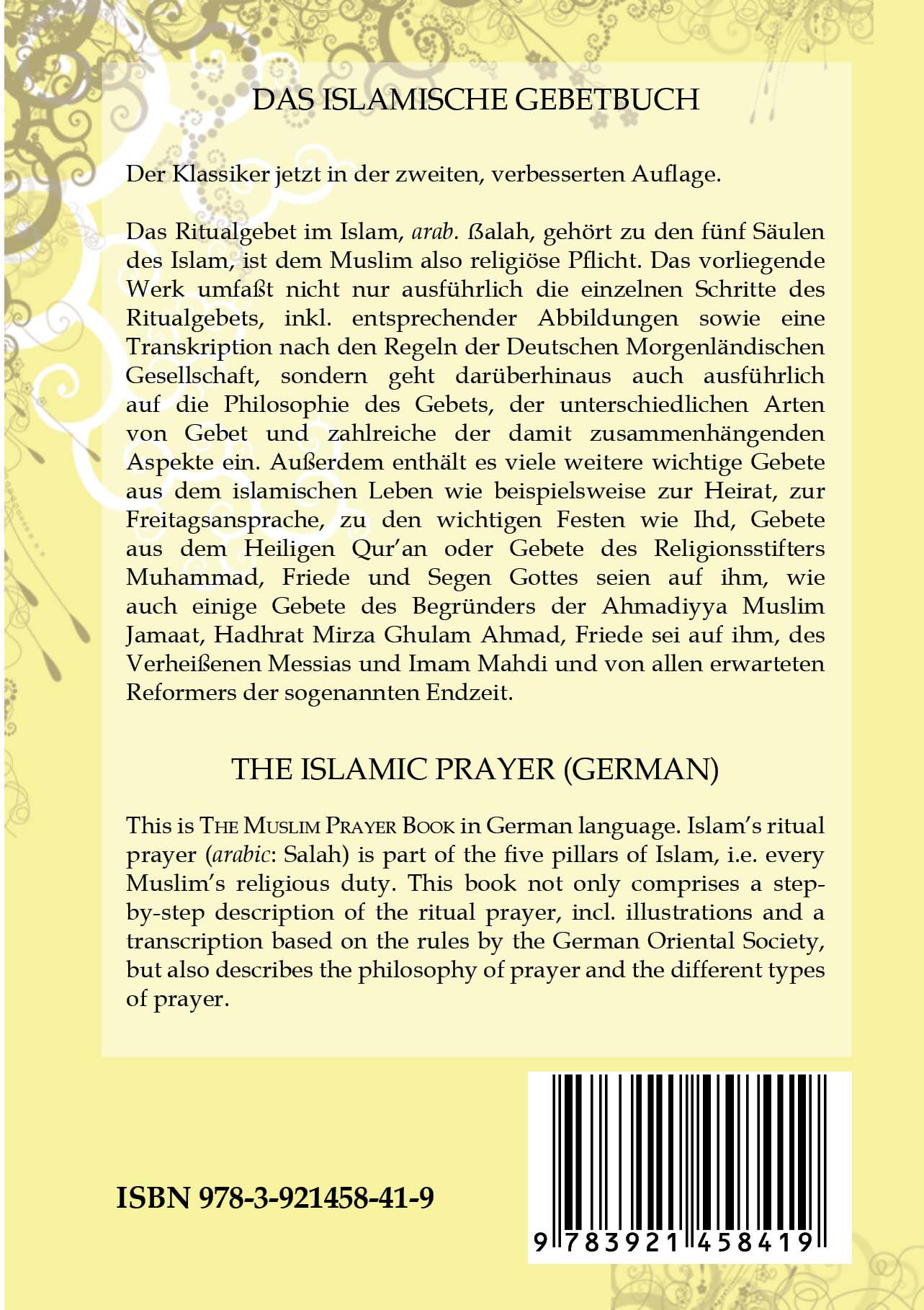 Das Ritualgebet im Islam gehört zu den fünf Säulen des Islam - ist dem Muslim also religiöse Pflicht. Das vorliegende Werk umfasst nicht nur ausführlich die einzelnen Schritte des Ritualgebets, inklusive entsprechender Abbildungen sowie eine Transkription nach den Regeln der Deutschen Morgenländischen Gesellschaft, sondern geht darüber hinaus auch ausführlich auf die Philosophie des Gebets, der unterschiedlichen Arten von Gebet und zahlreiche der damit zusammenhängenden Aspekte ein. Außerdem enthält es viele weitere wichtige Gebete aus dem islamischen Leben wie beispielsweise zur Heirat, zur Freitagsansprache, zu den wichtigen Festen wie Ihd, Gebete aus dem Heiligen Qur'an oder Gebete des Religionsstifters Muhammad, Friede und Segen Gottes seien auf ihm, wie auch einige Gebete des Begründers der Ahmadiyya Muslim Jamaat, Hadhrat Mirza Ghulam Ahmad.