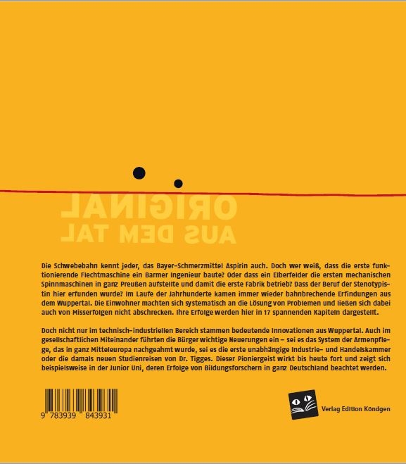 In Wuppertal wurden nicht nur Aspirin, Schwebebahn und Antibiotikum erfunden, sondern auch die erste Flechtmaschine, der Beruf der Stenotypistin und pauschale Studienreisen. Die erste moderne Handelskammer, das System der Armenpflege und das Tanztheater Pina Bausch sowie die Ideen von Friedrich Engels verbreiteten sich schnell in ganz Europa. All diese Erfindungen beleuchten Ralf Putsch und Tanja Heil in ihrem Buch „Original aus dem Tal. Wuppertaler Innovationen und Pionierleistungen“.