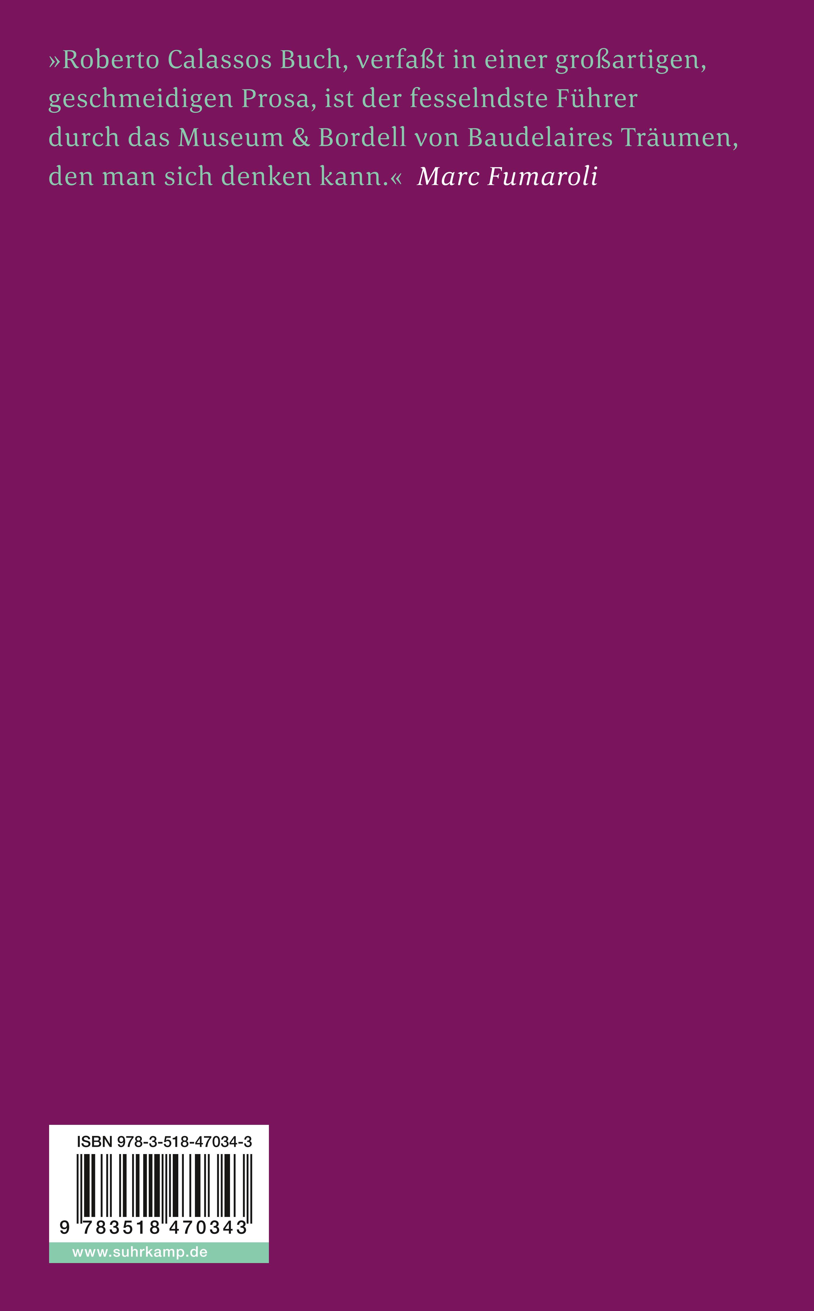 lt;p>Auf den Spuren Baudelaires, dessen Traum von einer Mischung zwischen Museum und Bordell im Zentrum des Buchs steht, hat Calasso einen Ort geschaffen, wo der Leser dem Dichter selbst begegnet, seinen Zeitgenossen, seiner Stadt und seinen außergewöhnlichen Vorlieben und Abneigungen. Am Ende lässt sich feststellen, dass dieser Ort nichts weniger als das Land der »absoluten Literatur« ist.
