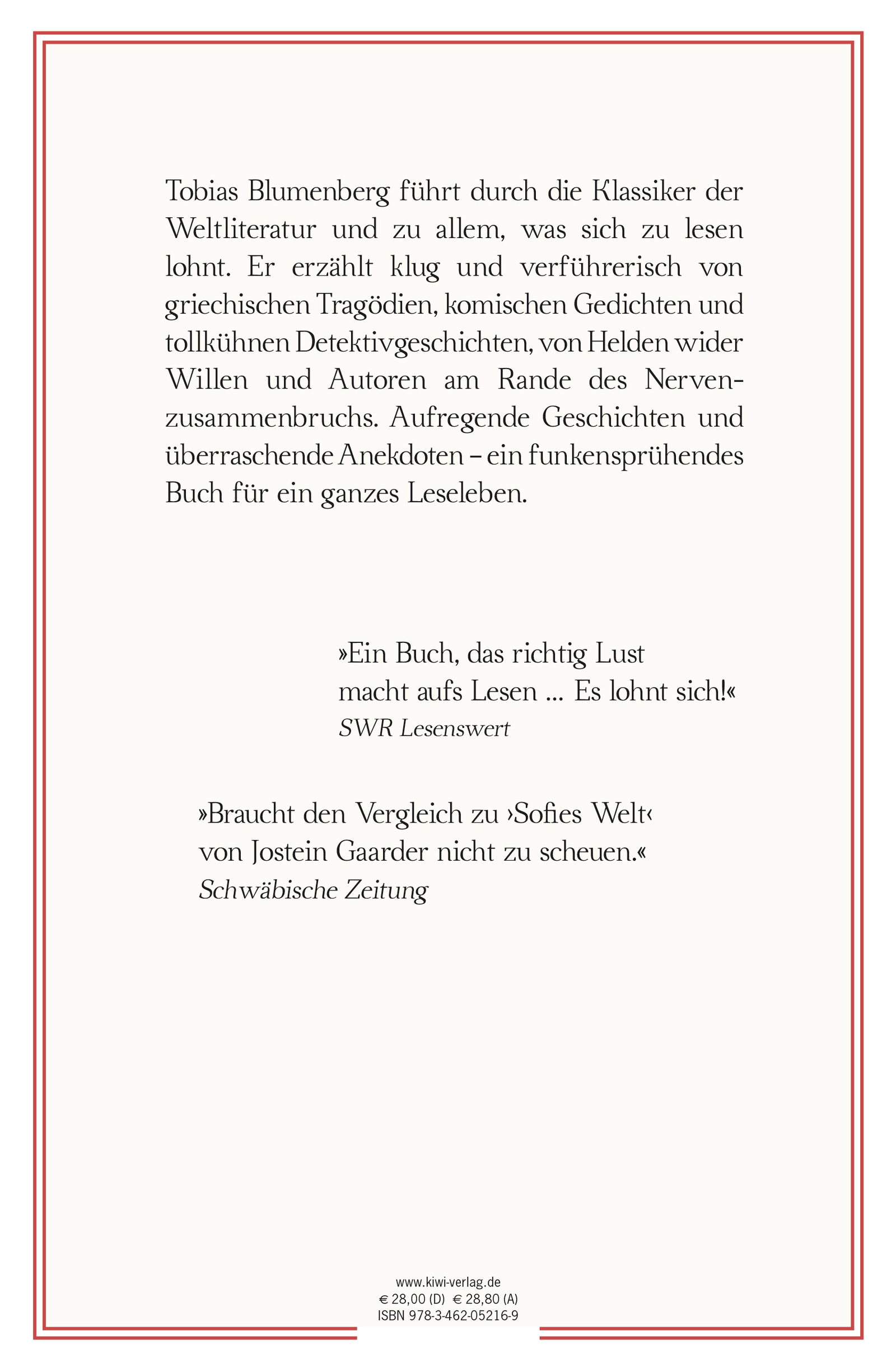 Die große Lesereise beginnt bei »Don Quixote«, »Moby Dick« und Dostojewskis »Idiot« - und dann geht es auf große Fahrt. Der Lesebegleiter ist ein Abenteurer: Er reist mit uns durch die Zeit, zum Gilgamesch-Epos oder den mittelalterlichen Heldensagen, und einmal um die ganze Welt. Er ist ein Verführer, der uns seine Lieblingsbücher ans Herz legt - nicht nur Klassiker, sondern auch Detektivgeschichten oder Jugendbücher. Und er ist ein Freund, der uns vor Lektüren warnt, mit denen wir unsere Zeit verplempern. Niemals vergisst er die Poesie! Vor allem aber ist er ein glänzender Erzähler. Er kennt wunderbare Anekdoten; er lobt, tadelt, scherzt; und er erklärt, welche Parallelen es in Musik und bildender Kunst gibt.