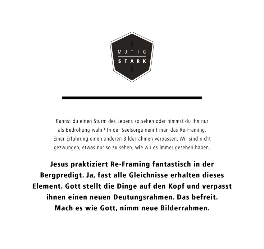 Ein Aufsteller als Inspiration für ein ganzes Jahr. Kurze, markante Impulse regen an, sich mit Gott auf den Weg durch die Woche zu machen, mutig und stark die eigene Geschichte zu leben. Jede Woche ist mit einem Bild und einem kleinen Impuls gestaltet.