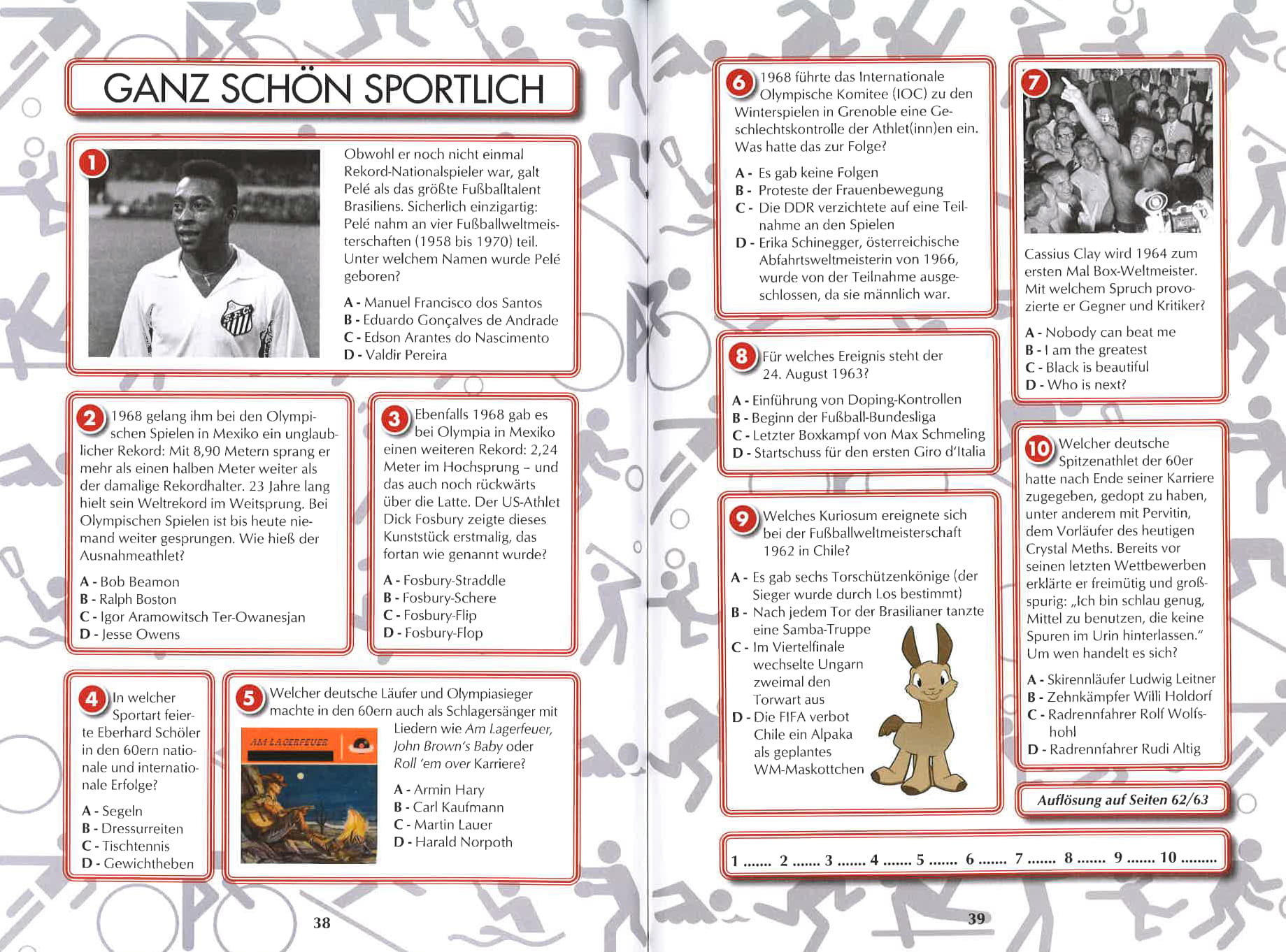 Können Sie sich noch an die 60er-Jahre erinnern? Dann werden Ihnen sicherlich Themen wie der erste Auftritt der Beatles in Hamburg, die Studentenproteste und der Auftakt der Fußballbundesliga in den Sinn kommen. Bestimmt kennen Sie noch die großen Shows im Fernsehen, haben Psycho oder Die Reifeprüfung im Kino gesehen, legendäre Konzerte miterlebt und Ihre Jeans selbst ausgewaschen. Die Autos hatten keine Sicherheitsgurte und mit dem Moped oder dem Roller fuhr man selbstverständlich ohne Helm. Wenn Sie sich gerne an die 60er zurückerinnern, haben Sie mit diesem Rätselbuch die richtige Unterhaltung zur Hand. Hier geht es mit Quizfragen, Kreuzwort-, Silben- und Bilderrätseln auf die Zeitreise der eigenen Erinnerungen. Willkommen in den 60er!