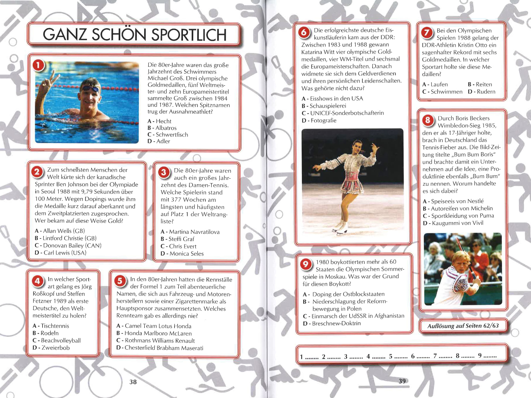 Können Sie sich noch an die 80er-Jahre erinnern? Dann werden Ihnen sicherlich Themen wie Tschernobyl, die gefälschten Hitler-Tagebücher, der Mauerfall oder die Ära Kohl in den Sinn kommen. Bestimmt haben Sie die Hochzeit von Lady Diana und Prince Charles oder den Wimbledon-Triumph von Boris Becker im Fernsehen verfolgt. Ein bisschen Frieden gewann den Grand Prix Eurovision und Steffi Graf ihre Grand Slams. Die NDW hörten wir auf dem Walkman, die Grünen zogen in den Bundestag ein und Honecker warf das Handtuch. Wenn Sie sich gerne an die 80er zurückerinnern, haben Sie mit diesem Rätselbuch die richtige Unterhaltung zur Hand. Hier geht es mit Quizfragen, Kreuzwort-, Silben- und Bilderrätseln auf die Zeitreise der eigenen Erinnerungen. Willkommen in den 80er!