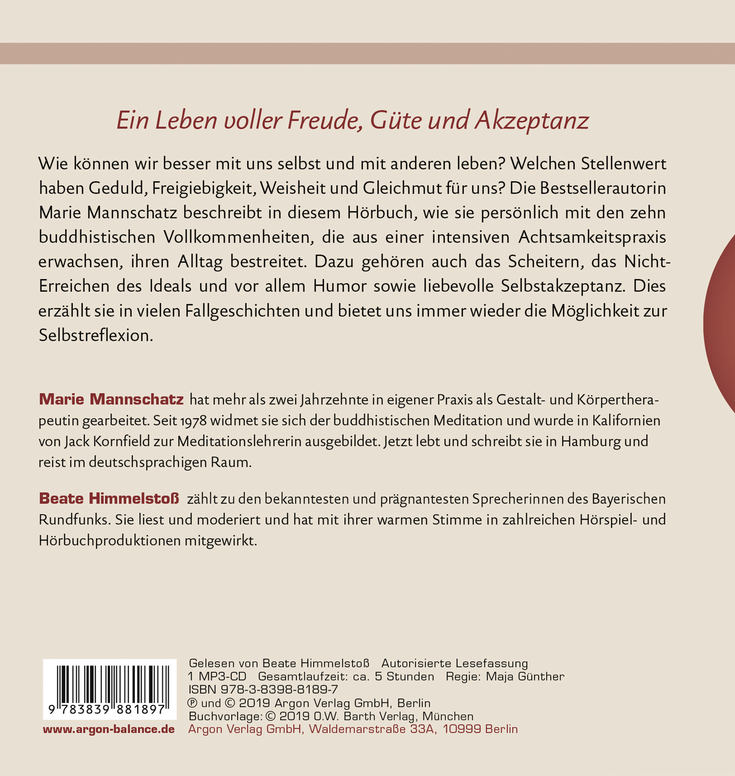 Wie können wir besser mit uns selbst und mit anderen leben? Welchen Stellenwert haben Geduld, Freigiebigkeit, Weisheit und Gleichmut für uns? Die Bestsellerautorin Marie Mannschatz beschreibt in ihrem neuen Hörbuch, wie sie persönlich mit den zehn buddhistischen Vollkommenheiten, die aus einer intensiven Achtsamkeitspraxis erwachsen, ihren Alltag bestreitet. Dazu gehören auch das Scheitern, das Nicht-Erreichen des Ideals und vor allem Humor und liebevolle Selbstakzeptanz. Dies erzählt sie in vielen Fallgeschichten ihrer Schülerinnen und Schüler und bietet uns immer wieder die Möglichkeit zur Selbstreflexion.