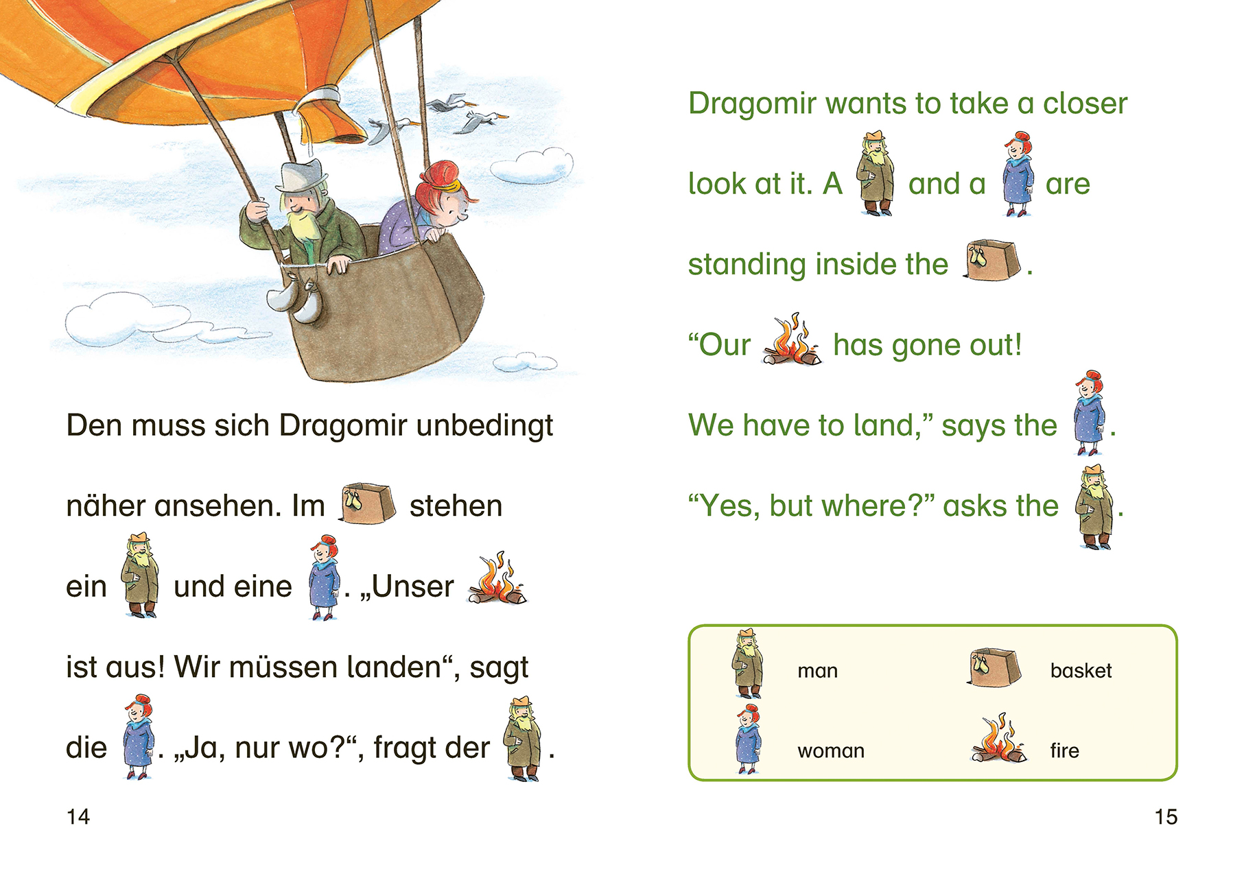 Dragomir ist ein freundlicher Drache. Heute hat er es sich auf einer Wolke gemütlich gemacht. Da entdeckt er plötzlich zwei Ballonfahrer, deren Ballon dringend Feuer braucht. Keine Frage, dass Dragomir zur Hilfe eilt.