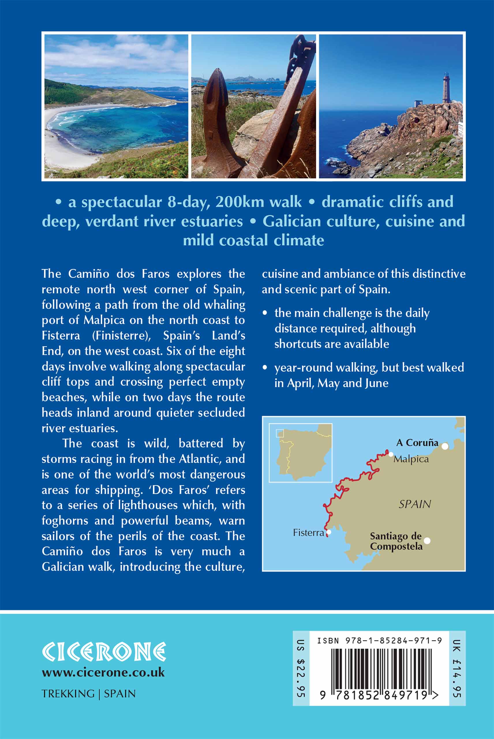 A guidebook to walking the Camino dos Faros, the Way of the Lighthouses, between Malpica and Fisterra. Covering 200km (124 miles), this pilgrimage route along the Galician coast in northwest Spain takes around 1 week and is suitable for any reasonably fit walker.