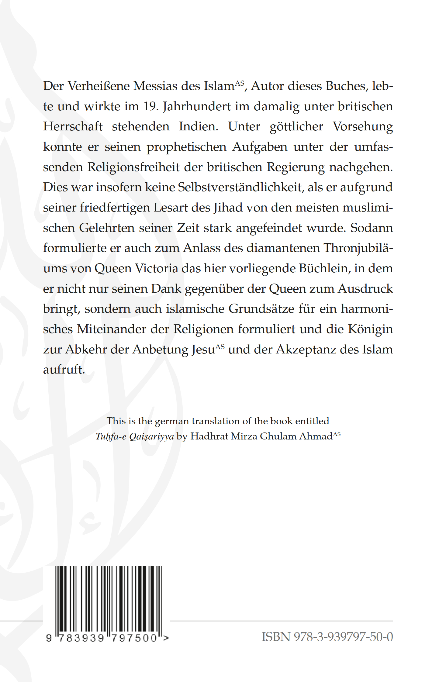 Der Verheißene Messias des Islam (as), Autor dieses Buches, lebte und wirkte im 19. Jahrhundert im damalig unter britischen Herrschaft stehenden Indien. Unter göttlicher Vorsehung konnte er seinen prophetischen Aufgaben unter der umfassenden Religionsfreiheit der britischen Regierung nachgehen. Dies war insofern keine Selbstverständlichkeit, als er aufgrund seiner friedfertigen Lesart des Jihad von den meisten muslimischen Gelehrten seiner Zeit stark angefeindet wurde. Sodann formulierte er auch zum Anlass des diamantenen Thronjubiläums von Queen Victoria das hier vorliegende Büchlein, in dem er nicht nur seinen Dank gegenüber der Queen zum Ausdruck bringt, sondern auch islamische Grundsätze für ein harmonisches Miteinander der Religionen formuliert und die Königin zur Abkehr der Anbetung Jesu (as) und der Akzeptanz des Islam aufruft.
