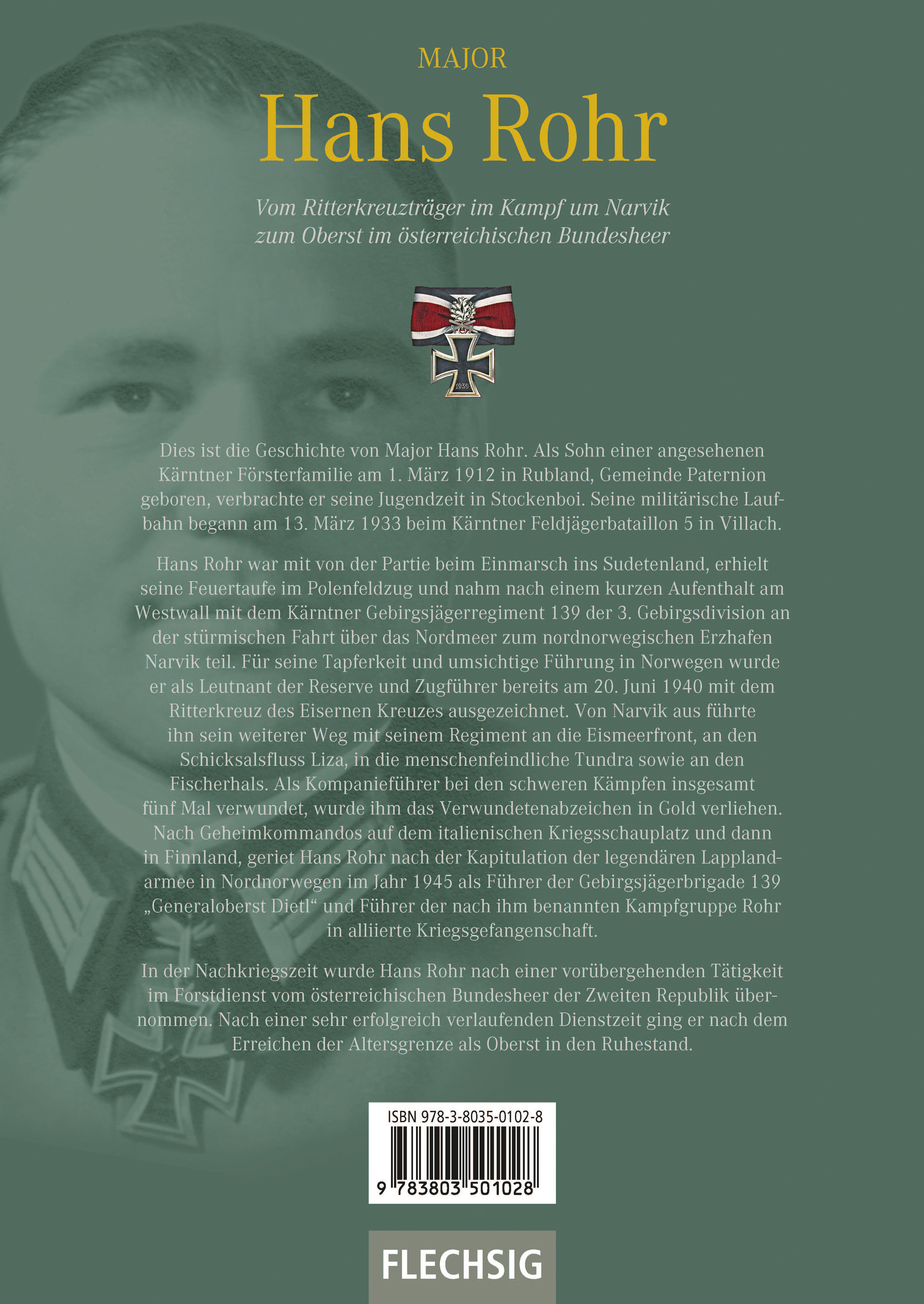 Dies ist die Geschichte von Major Hans Rohr. Als Sohn einer angesehenen Kärntner Försterfamilie am 1. März 1912 in Rubland, Gemeinde Paternion geboren, verbrachte er seine Jugendzeit in Stockenboi. Seine militärische Laufbahn begann am 13. März 1933 beim Kärntner Feldjägerbataillon 5 in Villach.Hans Rohr war mit von der Partie beim Einmarsch ins Sudetenland, erhielt seine Feuertaufe im Polenfeldzug und nahm nach einem kurzen Aufenthalt am Westwall mit dem Kärntner Gebirgsjägerregiment 139 der 3. Gebirgsdivision an der stürmischen Fahrt über das Nordmeer zum nordnorwegischen Erzhafen Narvik teil. Für seine Tapferkeit und umsichtige Führung in Norwegen wurde er als Leutnant der Reserve und Zugführer bereits am 20. Juni 1940 mit dem Ritterkreuz des Eisernen Kreuzes ausgezeichnet. Von Narvik aus führte ihn sein weiterer Weg mit seinem Regiment an die Eismeerfront, an den Schicksalsfluss Liza, in die menschenfeindliche Tundra sowie an den Fischerhals. Als Kompanieführer bei den schweren Kämpfen insgesamt fünf Mal verwundet, wurde ihm das Verwundetenabzeichen in Gold verliehen. Nach Geheimkommandos auf dem italienischen Kriegsschauplatz und dann in Finnland, geriet Hans Rohr nach der Kapitulation der legendären Lapplandarmee in Nordnorwegen im Jahr 1945 als Führer der Gebirgsjägerbrigade 139 "Generaloberst Dietl" und Führer der nach ihm benannten Kampfgruppe Rohr in alliierte Kriegsgefangenschaft.In der Nachkriegszeit wurde Hans Rohr nach einer vorübergehenden Tätigkeit im Forstdienst vom österreichischen Bundesheer der Zweiten Republik übernommen. Nach einer sehr erfolgreich verlaufenden Dienstzeit ging er nach dem Erreichen der Altersgrenze als Oberst in den Ruhestand.