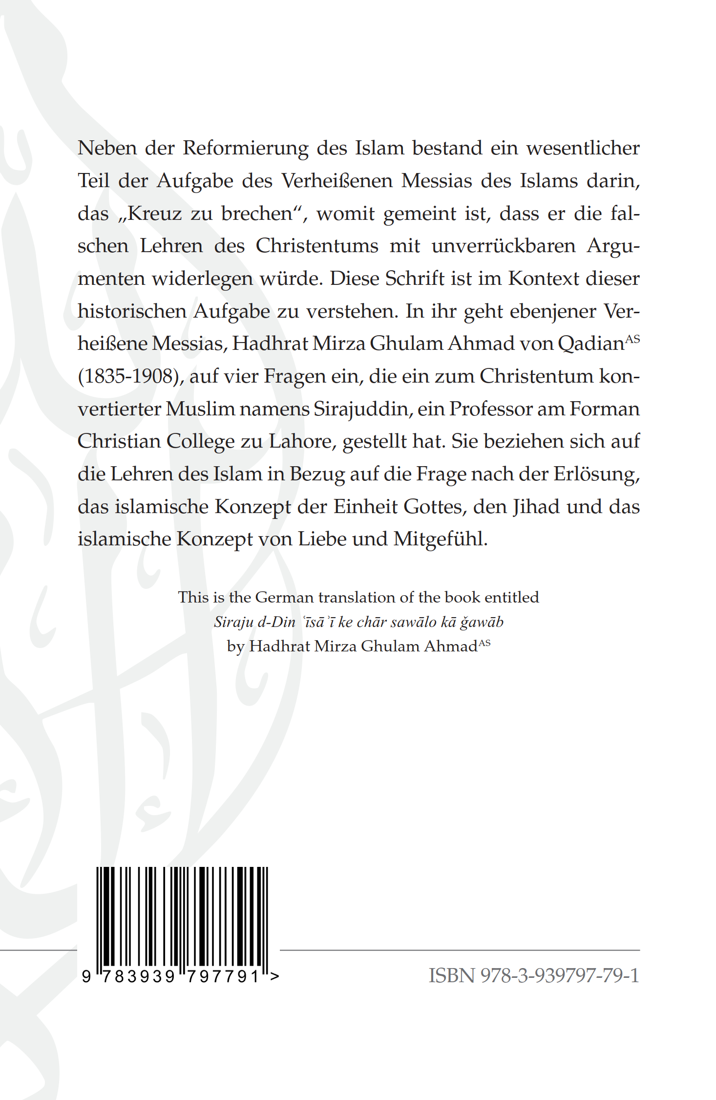 Neben der Reformierung des Islam bestand ein wesentlicher Teil der Aufgabe des Verheißenen Messias des Islam darin, das "Kreuz zu brechen", womit gemeint ist, dass er die falschen Lehren des Christentums mit unverrückbaren Argumenten widerlegen würde. Diese Schrift ist im Kontext dieser historischen Aufgabe zu verstehen. In ihr geht ebenjener Verheißene Messias, Hadhrat Mirza Ghulam Ahmad von Qadian (as), auf vier Fragen ein, die ein zum Christentum konvertierter Muslim namens Sirajuddin, ein Professor am Forman Christian College zu Lahore, gestellt hat. Sie beziehen sich auf die Lehren des Islam in Bezug auf die Frage nach der Erlösung, das islamische Konzept der Einheit Gottes, den Jihad und das islamische Konzept von Liebe und Mitgefühl.