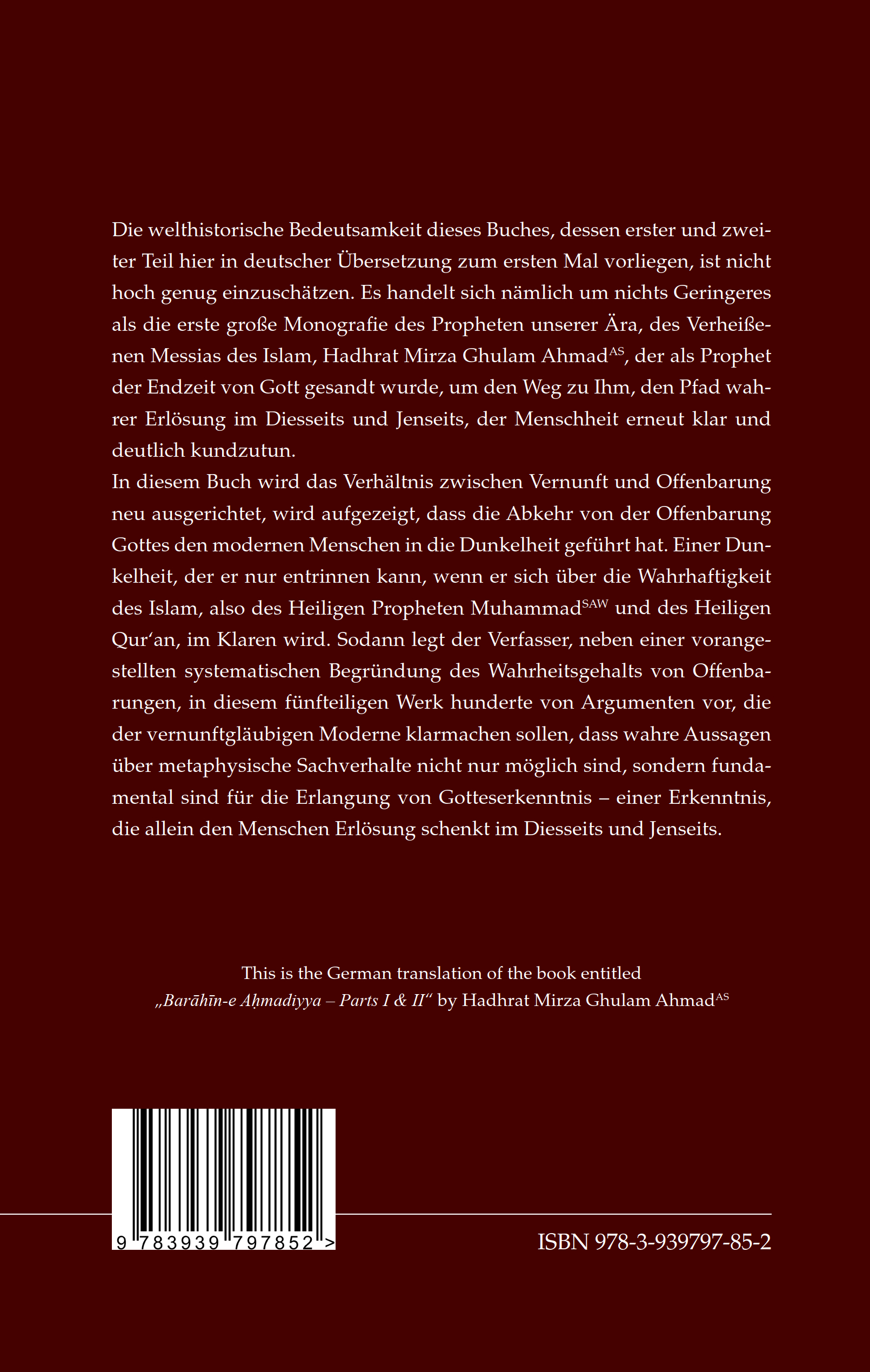 Die welthistorische Bedeutsamkeit dieses Buches, dessen erster und zweiter Teil hier vorliegt, ist nicht hoch genug einzuschätzen. Es handelt sich nämlich um nichts Geringeres als die erste große Monografie des Propheten unserer Ära, des Verheißenen Messias des Islam, Hadhrat Mirza Ghulam Ahmad (as), der als Prophet der Endzeit von Gott gesandt wurde, um den Weg zu Ihm, den Pfad wahrer Erlösung im Diesseits und Jenseits, der Menschheit erneut klar und deutlich kundzutun.