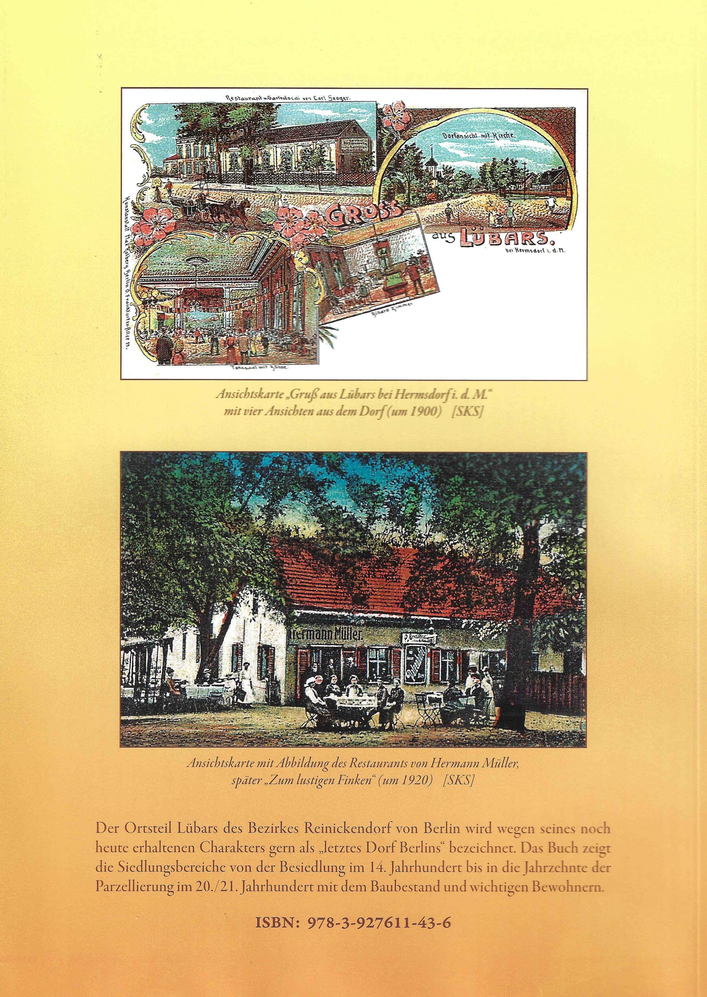 Der Ortsteil Lübars des Bezirkes Reinickendorf von Berlin wird wegen seines noch heute erhaltenen Charakters gern als "letztes Dorf Berlins" bezeichnet. Das Buch zeigt die Siedlungsbereiche von der Besiedlung im 14. Jahrhundert bis in die Jahrzehnte der Parzellierung im 20./21. Jahrhundert mit dem Baubestand und wichtigen Bewohnern.