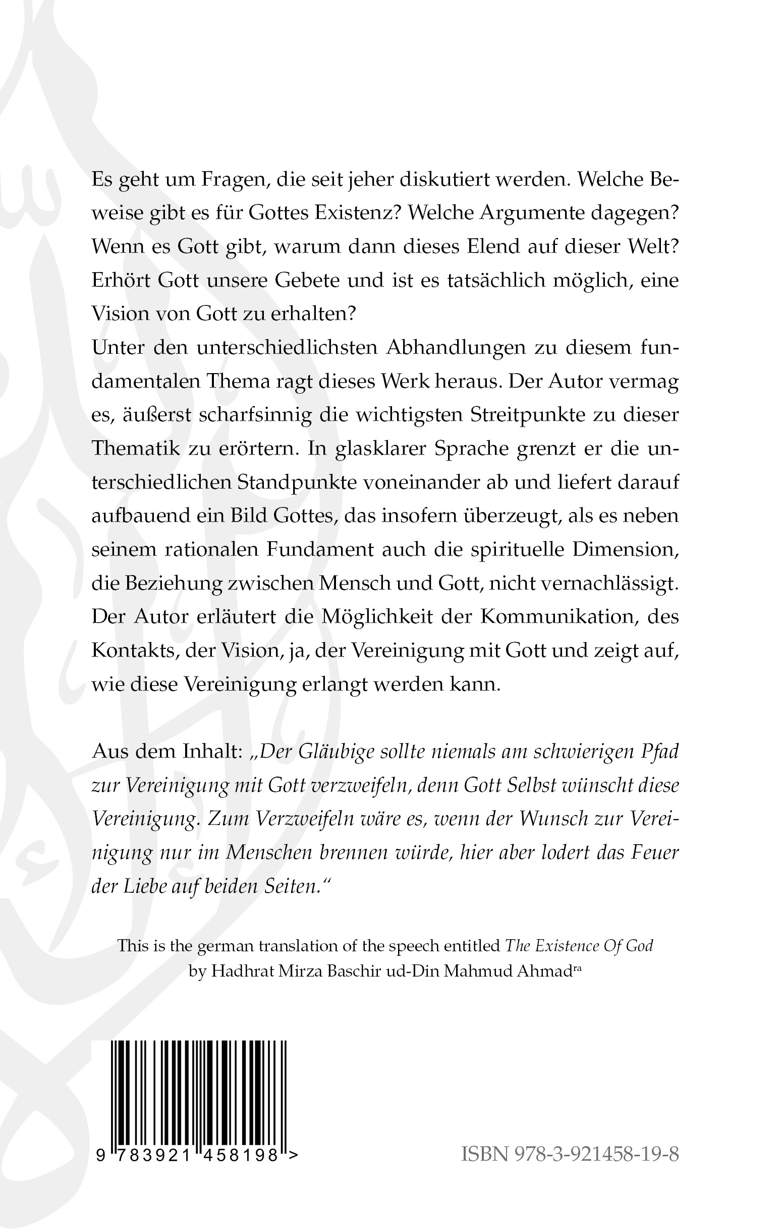 Dieses Buch behalndet Fragen, die seit Menschheitsgedenken diskutiert werden. Welche Beweise gibt es für Gottes Existenz? Welche Argumente dagegen? Wenn es Gott gibt, warum dann dieses Elend auf dieser Welt? Erhört Gott unsere Gebete und ist es tatsächlich möglich, eine Vision von Gott zu erhalten? Der Autor vermag es, äußerst scharfsinnig die wichtigsten Streitpunkte zu dieser Thematik zu erörtern. In klarer Sprache grenzt er die unterschiedlichen Standpunkte voneinander ab und liefert darauf aufbauend ein Bild Gottes, das insofern überzeugt, als es neben seinem rationalen Fundament auch die spirituelle Dimension, die Beziehung zwischen Mensch und Gott, nicht vernachlässigt. Der Autor erläutert die Möglichkeit der Kommunikation, des Kontakts, der Vision und der Vereinigung mit Gott und zeigt auf, wie diese Vereinigung erlangt werden kann.