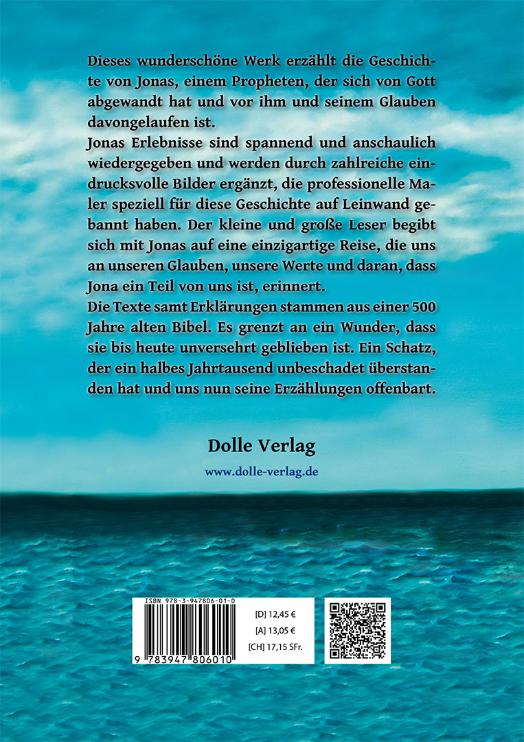 Bibelgeschichte vom Propheten Jona. Mit Abbildungen von Ölbildern zu der Geschichte, nicht in Comic oder verniedlichtem Stil. Die Texte stammen aus einer 500 Jahre alten Lutherbibel. Die Erklärungen sind von Prof. Dr Osiander geschreiben.