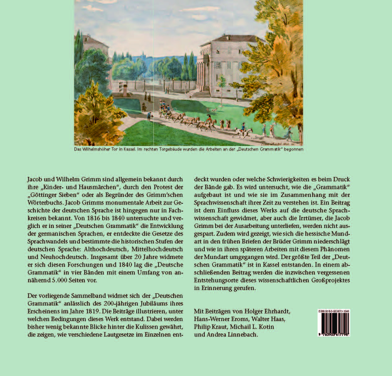 200 Jahre Deutsche Grammatik 2019: Grund genug für einen umfangreich bebilderten Sammelband über Jacob Grimms "Deutsche Grammatik".Jacob und Wilhelm Grimm sind allgemein bekannt durch ihre "Kinder- und Hausmärchen", durch den Protest der"Göttinger Sieben" oder als Begründer des Grimm'schen Wörterbuchs. Jacob Grimms monumentale Arbeit zur Geschichteder deutschen Sprache ist hingegen nur in Fachkreisen bekannt. Von 1816 bis 1840 untersuchte und verglicher in seiner "Deutschen Grammatik" die Entwicklung der germanischen Sprachen, er entdeckte die Gesetze desSprachwandels und bestimmte die historischen Stufen der deutschen Sprache: Althochdeutsch, Mittelhochdeutschund Neuhochdeutsch. Insgesamt über 20 Jahre widmete er sich diesen Forschungen und 1840 lag die "DeutscheGrammatik" in vier Bänden mit einem Umfang von annähernd 5.000 Seiten vor.Der vorliegende Sammelband befasst sich mit der "Deutschen Grammatik" anlässlich des 200-jährigen Jubiläums ihresErscheinens im Jahre 1819. Die Beiträge illustrieren, unter welchen Bedingungen dieses Werk entstand. Dabei werdenbisher wenig bekannte Blicke hinter die Kulissen gewährt,die zeigen, wie verschiedene Lautgesetze im Einzelnen entdeckt wurden oder welche Schwierigkeiten es beim Druckder Bände gab. Es wird untersucht, wie die "Grammatik" aufgebaut ist und wie sie im Zusammenhang mit derSprachwissenschaft ihrer Zeit zu verstehen ist. Ein Beitrag ist dem Einfluss dieses Werks auf die deutsche Sprachwissenschaft gewidmet, aber auch die Irrtümer, die Jacob Grimm bei der Ausarbeitung unterliefen, werden nicht ausgespart.Zudem wird gezeigt, wie sich die hessische Mundart in den frühen Briefen der Brüder Grimm niederschlägt und wie in ihren späteren Arbeiten mit diesem Phänomen der Mundart umgegangen wird. Der größte Teil der "Deutschen Grammatik" ist in Kassel entstanden. In einem abschließenden Beitrag werden die inzwischen vergessenen Entstehungsorte dieses wissenschaftlichen Großprojektes in Erinnerung gerufen.