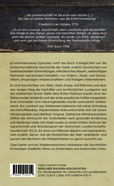 Hans-Joachim Kösters „Berliner Bauern-Geschichten“ sind dagegen eine kleine Sensation auf dem hart umkämpften Berlin-Buchmarkt – und dennoch kaum in einer Buchhandlung zu finden. Vielleicht deshalb, weil sich der Leser die historischen Spuren von Ackerbau und Viehzucht in der Hauptstadt nicht so richtig vorstellen kann. Da wird ihm geholfen! In unterhaltsamen Episoden wirft der Stadtbegleiter, wie das Buch im Untertitel heißt, Schlaglichter auf die Landwirtschaft Berlins.