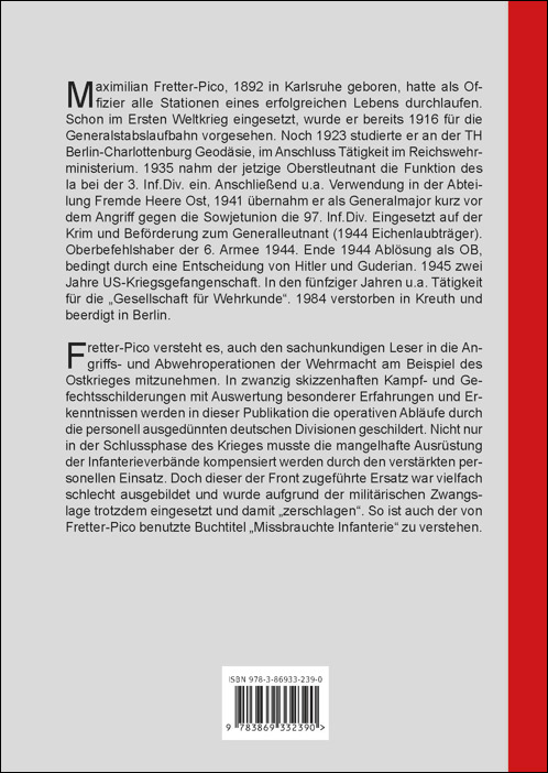 Maximilian Fretter-Pico, 1892 in Karlsruhe geboren, hatte als Offizier alle Stationen eines erfolgreichen Lebens durchlaufen. Schon im Ersten Weltkrieg eingesetzt, wurde er bereits 1916 für die Generalstabslaufbahn vorgesehen. Noch 1923 studierte er an der TH Berlin-Charlottenburg Geodäsie, im Anschluss Tätigkeit im Reichswehrministerium. 1935 nahm der jetzige Oberstleutnant die Funktion des Ia bei der 3. Inf.Div. ein. Anschließend u.a. Verwendung in der Abteilung Fremde Heere Ost, 1941 übernahm er als Generalmajor kurz vor dem Angriff gegen die Sowjetunion die 97. lnf.Div. Eingesetzt auf der Krim und Beförderung zum Generalleutnant (1944 Eichenlaubträger). Oberbefehlshaber der 6. Armee 1944. Ende 1944 Ablösung als OB, bedingt durch eine Entscheidung von Hitler und Guderian. 1945 zwei Jahre US-Kriegsgefangenschaft. In den fünfziger Jahren u.a. Tätigkeit für die "Gesellschaft für Wehrkunde". 1984 verstorben in Kreuth und beerdigt in Berlin.Fretter-Pico versteht es, auch den sachunkundigen Leser in die Angriffs- und Abwehroperationen der Wehrmacht am Beispiel des Ostkrieges mitzunehmen. In zwanzig skizzenhaften Kampf- und Gefechtsschilderungen mit Auswertung besonderer Erfahrungen und Erkenntnissen werden in dieser Publikation die operativen Abläufe durch die personell ausgedünnten deutschen Divisionen geschildert. Nicht nur in der Schlussphase des Krieges musste die mangelhafte Ausrüstung der Infanterieverbände durch den verstärkten personellen Einsatz durch den verstärkten personellen Einsatz kompensiert werden. Doch dieser der Front zugeführte Ersatz war vielfach schlecht ausgebildet und wurde aufgrund der militärischen Zwangslage trotzdem eingesetzt und damit "zerschlagen". So ist auch der von Fretter-Pico benutzte Buchtitel "Missbrauchte Infanterie" zu verstehen.