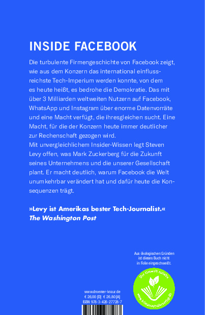 "Steven Levy [...] schreibt einen mitreißenden Bericht aus dem Inneren des Unternehmens, der veranschaulicht, warum Facebook die Welt unumkehrbar verändert hat und dafür heute die Konsequenzen trägt."