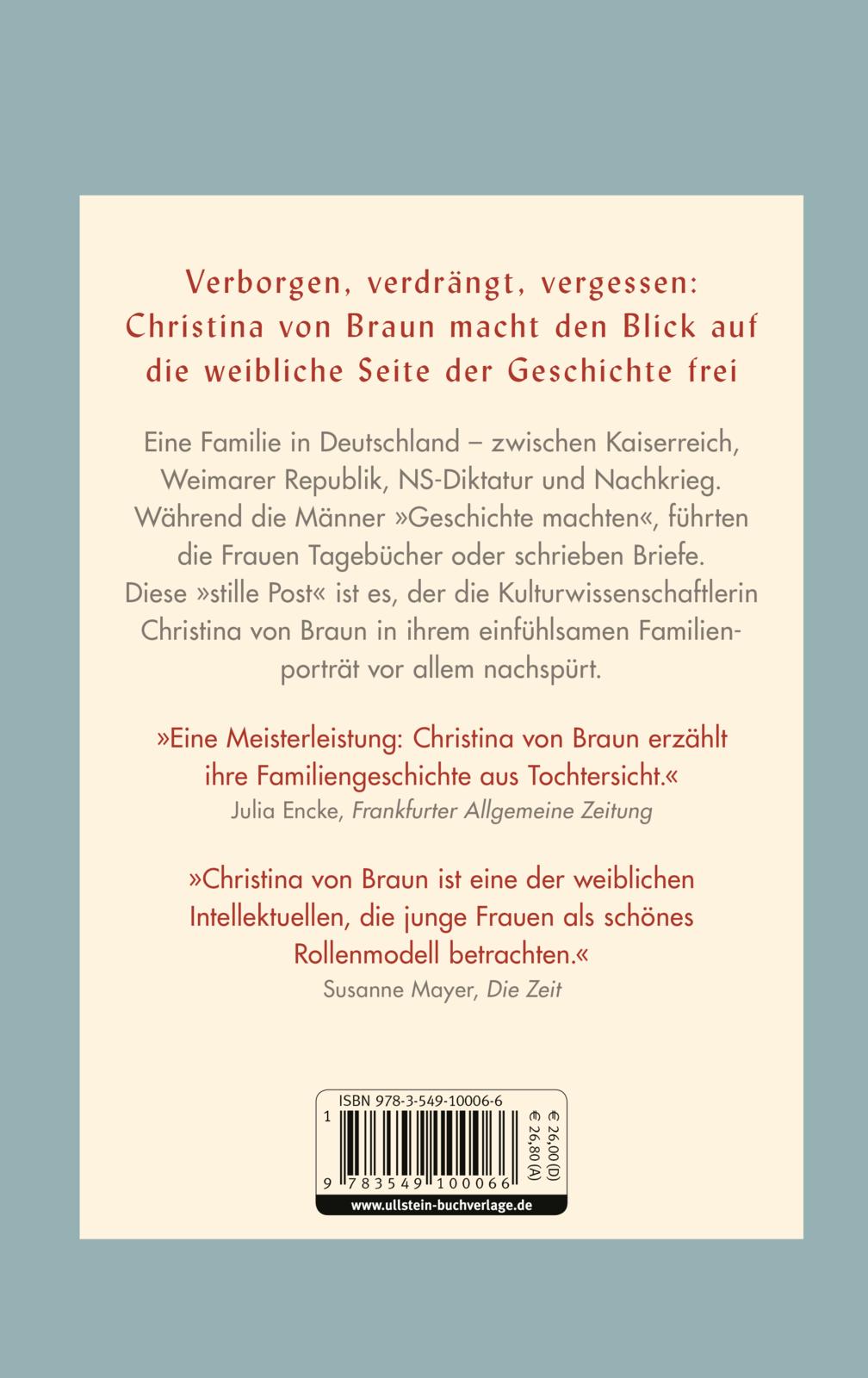 Die Männer der Familie von Braun schrieben Geschichte: Christina von Brauns Vater war Diplomat. Ihr Großvater Magnus von Braun der erste Reichspressechef. Ihr Onkel der Raketenpionier Wernher von Braun. Wo aber blieben die Frauen? In den Tagebüchern und Briefen erkundet die Autorin die Lebensgeschichten ihrer Vorfahrinnen: Großmutter Hildegard Margis, Frauenrechtlerin und Unternehmerin der ersten Stunde, wird 1944 von der Gestapo wegen ihrer Kontakte zum Widerstand verhaftet. Wenig später stirbt sie im Gefängnis. Hilde, ihre Tochter, verschlägt es während des Krieges in den Vatikan, wo sie sich in eine tragische Affäre verstrickt und daran beinahe zerbricht.