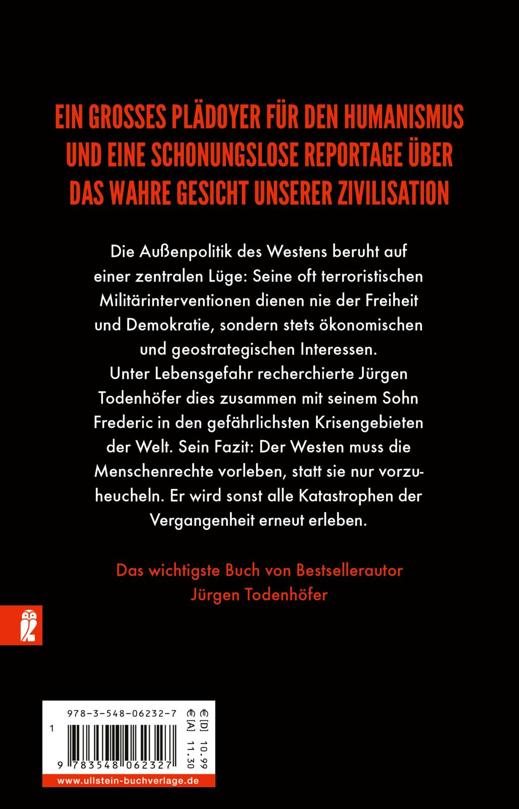 Die Außenpolitik des Westens beruht auf einer zentralen Lüge: Seine oft terroristischen Militärinterventionen dienen nie der Freiheit und Demokratie, sondern stets ökonomischen und geostrategischen Interessen. Unter Lebensgefahr recherchierte Jürgen Todenhöfer dies zusammen mit seinem Sohn Frederic in den gefährlichsten Krisengebieten der Welt. Sein Fazit: Der Westen muss die Menschenrechte vorleben, statt sie nur vorzuheucheln. Und seine Medien müssen damit aufhören, diese Heuchelei zu decken. Der Westen wird sonst alle Katastrophen der Vergangenheit erneut erleben. Er muss andere Völker und Kulturen so behandeln, wie er selbst behandelt werden will. Nur dann hat er eine Zukunft.