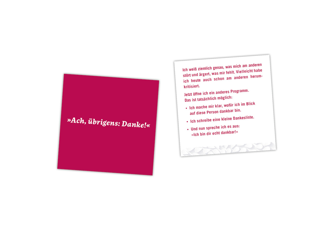 Während Talk-Boxen vor allem gute Gespräche in lockerer Runde anregen, geben Think-Boxen Impulse zur Selbstreflexion. Neben der persönlichen Beschäftigung mit einem Thema sind sie auch ein wertvolles Tool für Gespräche im kleinen Kreis, in der Seminar- und Gruppenarbeit oder in Seelsorge und Mentoring. Jede der quadratischen Karten hilft, eigenen Gedanken und Haltungen auf die Spur zu kommen und die Freiheit zu gewinnen, Dinge neu und anders zu betrachten.