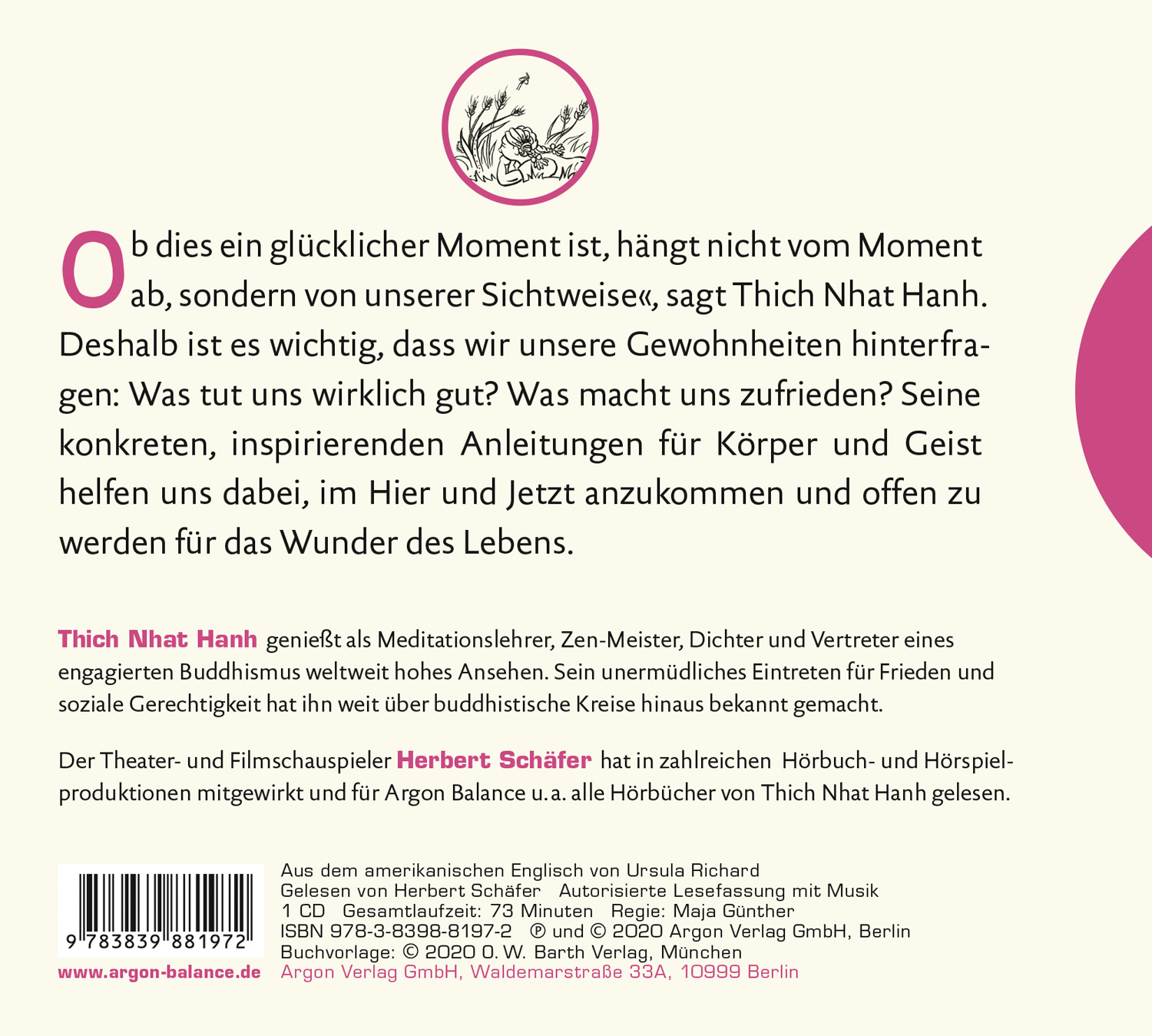 | Schlagworte | Achtsamkeit • Anleitung • Buddhismus • Gewohnheit • Glücklich • Lebensfreude • Meditationsübung • Sinn des Lebens • Wahrnehmung • Zen |