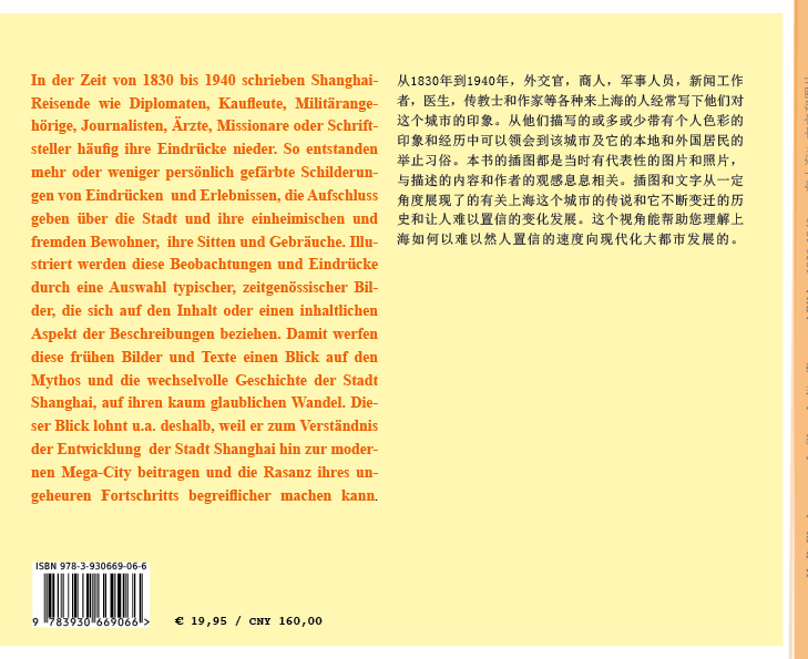 In der Zeit von 1830 bis 1940 schrieben Shanghai-Reisende wie Diplomaten, Kaufleute, Militärangehörige, Journalisten, Ärzte, Missionare oder Schriftsteller häufig ihre Eindrücke nieder. So entstanden mehr oder weniger persönlich gefärbte Schilderungen von Eindrücken und Erlebnissen, die Aufschluss geben über die Stadt und ihre einheimischen und fremden Bewohner, ihre Sitten und Gebräuche. Illustriert werden diese Beobachtungen und Eindrücke durch eine Auswahl typischer, zeitgenössischer Bilder (schwarz-weiß und farbig), die sich auf den Inhalt oder einen inhaltlichen Aspekt der Beschreibungen beziehen. Damit werfen diese frühen Bilder und Texte einen Blick auf den Mythos und die wechselvolle Geschichte der Stadt Shanghai, auf ihren kaum glaublichen Wandel. Dieser Blick lohnt u.a. deshalb, weil er zum Verständnis der Entwicklung der Stadt Shanghai hin zur modernen Mega-City beitragen und die Rasanz ihres ungeheuren Fortschritts begreiflicher machen kann.