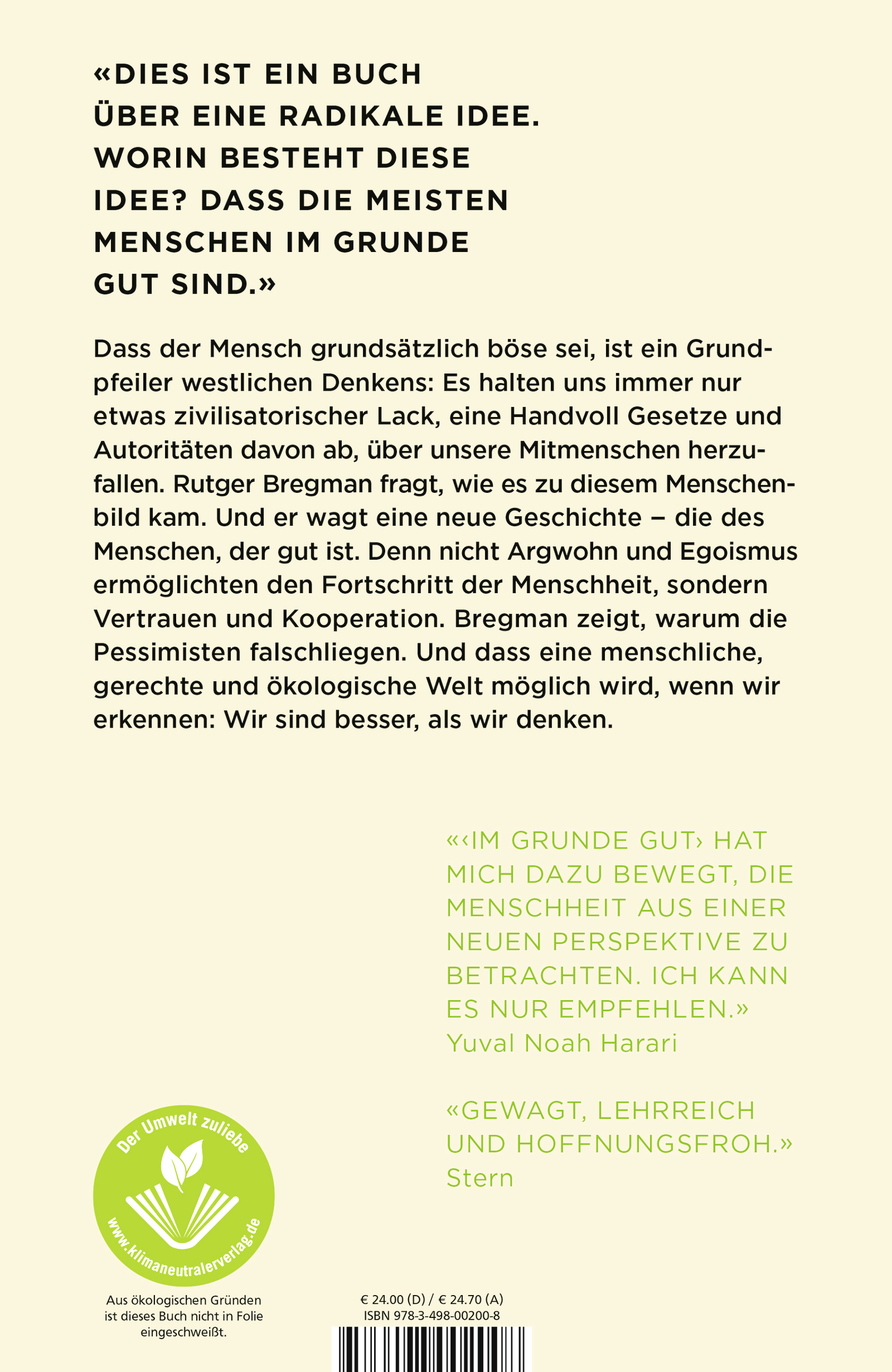 «Ich habe die Lektüre von IM GRUNDE GUT sehr genossen, und obwohl ich nicht alle Schlussfolgerungen teile, hat es mich dazu bewegt, die Menschheit aus einer neuen Perspektive zu betrachten und noch dazu viele alte Überzeugungen zu überdenken. Ich kann es deshalb nur empfehlen und bin davon überzeugt, dass es viele konstruktive Diskussionen anstoßen wird.»