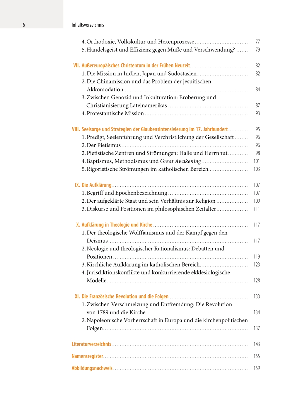 Vorwort 7I. Vom Mittelalter zur Neuzeit: ein Epochenübergang 91. Beginn der Neuzeit: Die Problematik von Abgrenzungen 92. Buchdruck, Stadtkultur und Territorialstaat 113. Der Beginn der europäischen Expansion 124. Konfessionelle Spaltung 14II. Martin Luther und die Wittenberger Reformation 161. Reform der Theologie durch Paulus und Augustinus 162.Vom Ablassstreit zum Kirchenbann 3. Die frühe reformatorische Bewegung: Dynamik, Medien und Ziele 234. Stadtreformation, Fürstenstaat und Bauernkrieg 26III. Die Reformation und das Reich 291. Zwischen Habsburger Universalmonarchie und deutschen Libertäten: Die Religionspolitik auf den Reichstagen bis 1530 292. Schmalkaldischer Bund, Religionsgespräche und Interim 1548 333. Der Augsburger Religionsfriede 1555 36IV. Die Reformation in der Schweiz, die radikale Reformation und die Entwicklung in England 381. Die Reformation in der Schweiz 392. Radikale Reformation: Die Täuferbewegung und der Spiritualismus 413. Jean Calvin und die Reformation in Genf und Westeuropa 444. Die Reformation in England 46V. Katholische Reform und Erneuerung 491. Ansätze und Dynamiken einer Kirchenreform 492. Das Ringen um ein Reformkonzil 553. Das Papsttum: Motor oder Bremsklotz einer Kirchenreform? 60VI. Das Europa der Konfessionsstaaten 661. Bekenntnisbildung, Konfessionalisierung und das Ideal des konfessionellen Einheitsstaates 662. Aspekte der konfessionellen Landkarte Europas 683. Der Dreißigjährige Krieg (1618-1648) 754.Orthodoxie, Volkskultur und Hexenprozesse 775. Handelsgeist und Effizienz gegen Muße und Verschwendung? 79VII. Außereuropäisches Christentum in der Frühen Neuzeit 821. Die Mission in Indien, Japan und Südostasien 822. Die Chinamission und das Problem der jesuitischen Akkomodation 843. Zwischen Genozid und Inkulturation: Eroberung und Christianisierung Lateinamerikas 874. Protestantische Mission 93VIII. Seelsorge und Strategien der Glaubensintensivierung im 17. Jahrhundert 951. Predigt, Seelenführung und Verchristlichung der Gesellschaft 962. Der Pietismus 962. Pietistische Zentren und Strömungen: Halle und Herrnhut 984. Baptismus, Methodismus und Great Awakening 1015. Rigoristische Strömungen im katholischen Bereich 103IX. Die Aufklärung 1071. Begriff und Epochenbezeichnung 1072. Der aufgeklärte Staat und sein Verhältnis zur Religion 1093. Diskurse und Positionen im philosophischen Zeitalter 111X. Aufklärung in Theologie und Kirche 1171. Der theologischeWolffianismus und der Kampf gegen den Deismus 1172. Neologie und theologischer Rationalismus: Debatten und Positionen 1193. Kirchliche Aufklärung im katholischen Bereich 1234. Jurisdiktionskonflikte und konkurrierende ekklesiologische Modelle 128XI. Die Franz_sische Revolution und die Folgen 1331. Zwischen Verschmelzung und Entfremdung: Die Revolution von 1789 und die Kirche 1342. Napoleonische Vorherrschaft in Europa und die kirchenpolitischen Folgen 137Literaturverzeichnis 143Namensregister 155Abbildungsnachweis 159