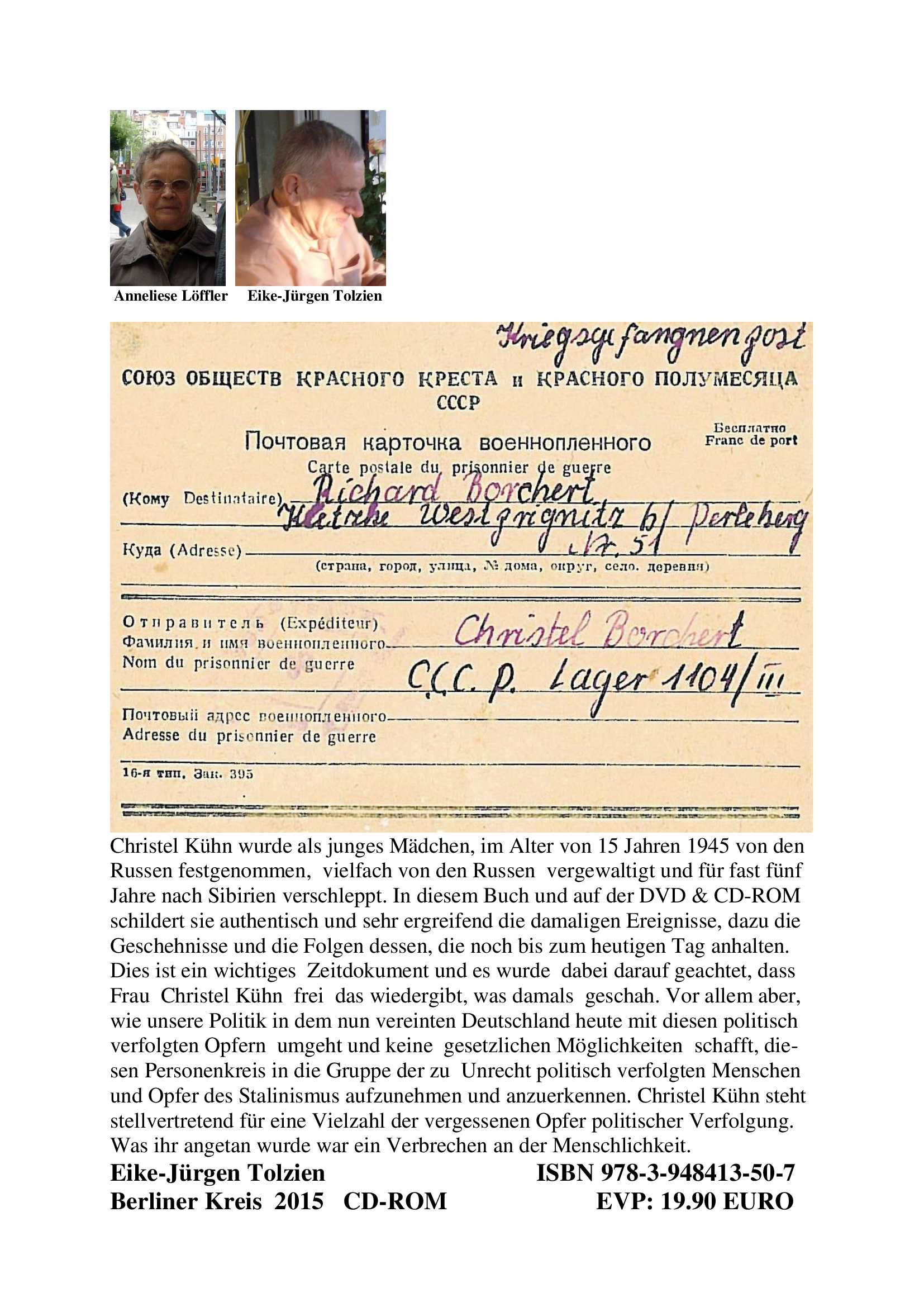 Christel Kühn, geb. Borchert, in Teichwalde bei Crossen, Mark Brandenburg. Sie besuchte die dortige Schule. Mit 15 Jahren wurde sie von den Russen nach vielfach vergewaltigt, kam vor ein Militärtribunal, wurde 1945, weil sie Deutsche war, zu fünf Jahren Zwangsarbeit verurteilt und dann nach Sibirien verschleppt. Dort musste sie von 1945 bis 1949 schwere Zwangsarbeit unter Einsatz ihres Lebens ableisten-immer dabei den Tod vor den Augen. Über diese schwere und schlimme Zeit berichtet sie in diesem Buch. In ihre Heimat konnte sie nicht wieder zurück. So landete sie nach der Rückkehr aus der Gefangenschaft in Gronenfelde und danach in Kletzke. Dort heiratete sie, arbeitete in der Landwirtschaft und bekam zwei Söhne. Später zog sie nach Bad Wilsnack und arbeitete dort in einer Möbelfabrik. Am 03.12.2019 ist sie verstorben. Dieses Buch aber erinnert weiter an sie.