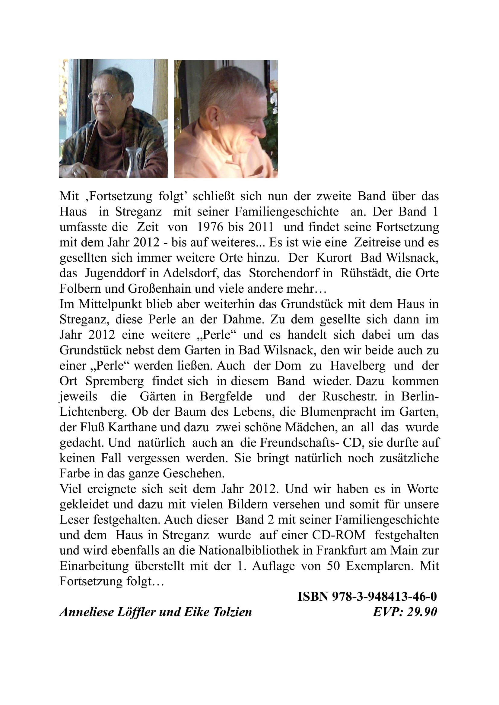 Viel ereignete sich seit dem Jahr 2012. Und wir haben es in Worte gekleidet und dazu mit vielen Bildern versehen und somit für unsere Leser festgehalten. Auch dieser Band 2 mit seiner Familiengeschichte und dem Haus in Streganz wurde auf einer CD-ROM festgehalten und wird ebenfalls an die Nationalbibliothek in Frankfurt am Main zur Einarbeitung überstellt mit der 1. Auflage. Mit Fortsetzung folgt…