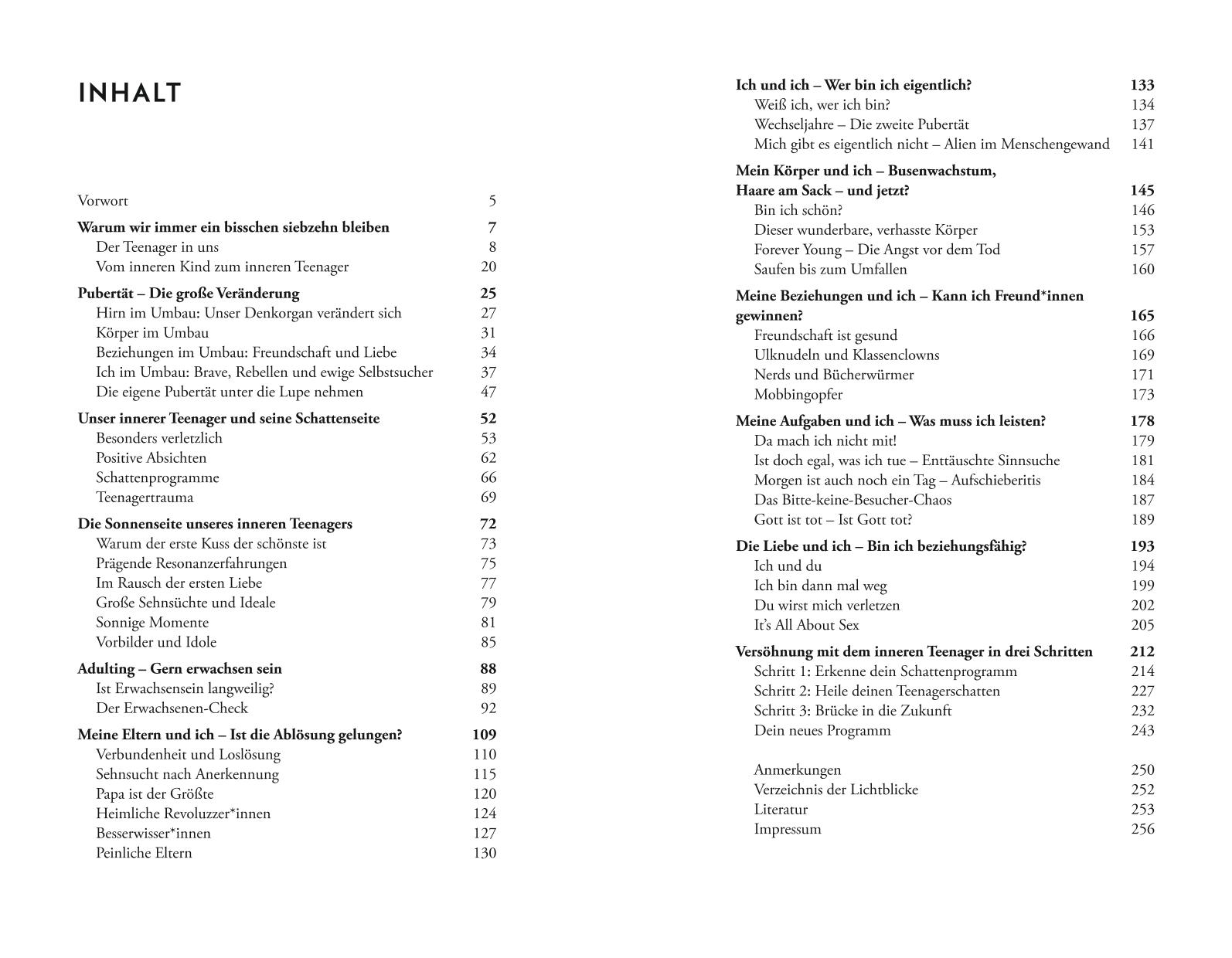 Hinweis zur OptimierungImpressumWichtiger HinweisDer innere Teenager lebt!GU Mind&Soul Plus AppVorwortWarum wir immer ein bisschen siebzehn bleibenPubertät - Die große VeränderungUnser innerer Teenager und seine SchattenseiteDie Sonnenseite unseres inneren TeenagersAdulting - Gern erwachsen seinMeine Eltern und ich - Ist die Ablösung gelungen?Ich und ich - Wer bin ich eigentlich?Mein Körper und ich - Busenwachstum, Haare am Sack - und jetzt?Meine Beziehungen und ich - Kann ich Freund*innen gewinnen?Meine Aufgaben und ich - Was muss ich leisten?Die Liebe und ich - Bin ich beziehungsfähig?Versöhnung mit dem inneren Teenager in drei SchrittenAnmerkungenLiteraturDanksagungDie Autorin