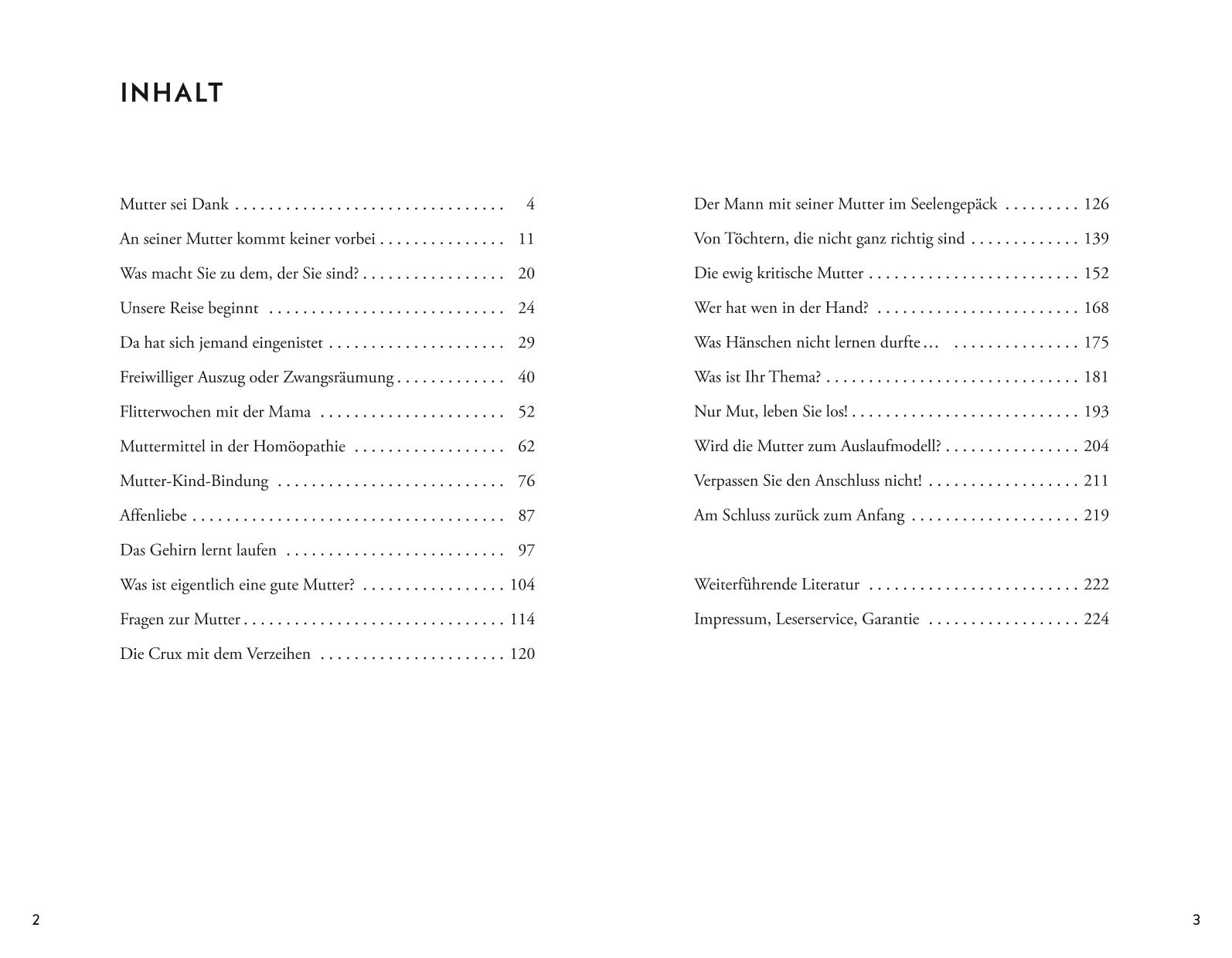 Hinweis zur OptimierungImpressumDer wichtigste Mensch in Ihrem Leben?Mutter sei DankAn seiner Mutter kommt keiner vorbeiWas macht Sie zu dem, der Sie sind?Unsere Reise beginntDa hat sich jemand eingenistetFreiwilliger Auszug oder ZwangsräumungFlitterwochen mit der MamaMuttermittel in der HomöopathieMutter-Kind-BindungAffenliebeDas Gehirn lernt laufenWas ist eigentlich eine gute Mutter?Fragen zur MutterDie Crux mit dem VerzeihenDer Mann mit seiner Mutter im SeelengepäckVon Töchtern, die nicht ganz richtig sindDie ewig kritische MutterWer hat wen in der Hand?Was Hänschen nicht lernen durfte_...Was ist Ihr Thema?Nur Mut, leben Sie los!Wird die Mutter zum Auslaufmodell?Verpassen Sie den Anschluss nicht!Am Schluss zurück zum AnfangWeiterführende LiteraturAdressenAngela Weiss