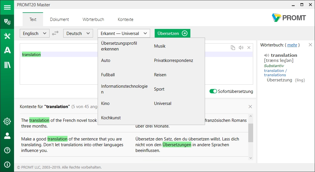 Übersetzungsprogramm mit intelligenter Textanalyse Englisch-Deutsch und Deutsch-Englisch für Privatanwender. Übersetzt tägliche Korrespondenz, Webseiten, PDFs sowie markierte Texte aus jeder Anwendung. Für Windows 8 und 10.