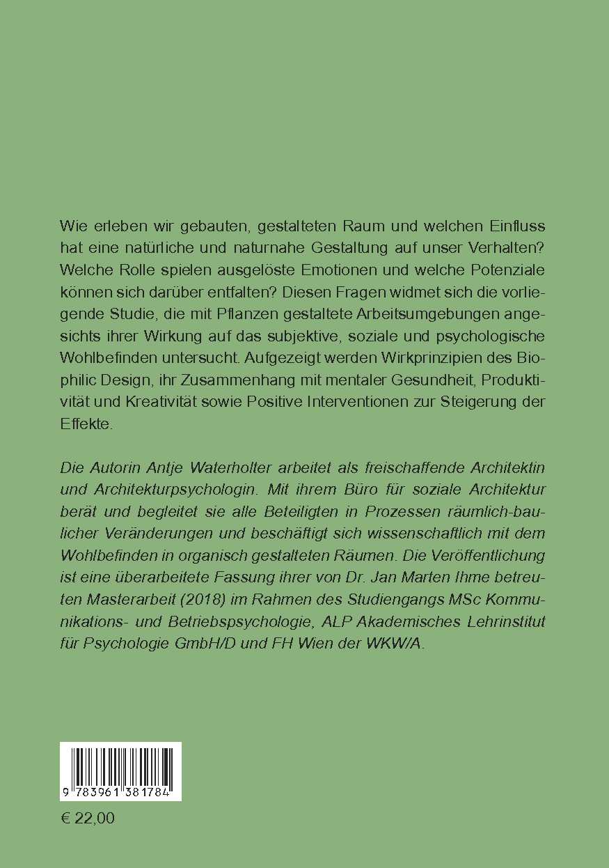 Die Autorin Antje Waterholter arbeitet als freischaffende Architektin und Architekturpsychologin. Mit ihrem Büro für soziale Architektur berät und begleitet sie alle Beteiligten in Prozessen räumlich-baulicher Veränderungen und beschäftigt sich wissenschaftlich mit dem Wohlbefinden in organisch gestalteten Räumen. Die Veröffentlichung ist eine überarbeitete Fassung ihrer von Dr. Jan Marten Ihme betreuten Masterarbeit (2018) im Rahmen des Studiengangs MSc Kommunikations- und Betriebspsychologie, ALP Akademisches Lehrinstitut für Psychologie GmbH/D und FH Wien der WKW/A.