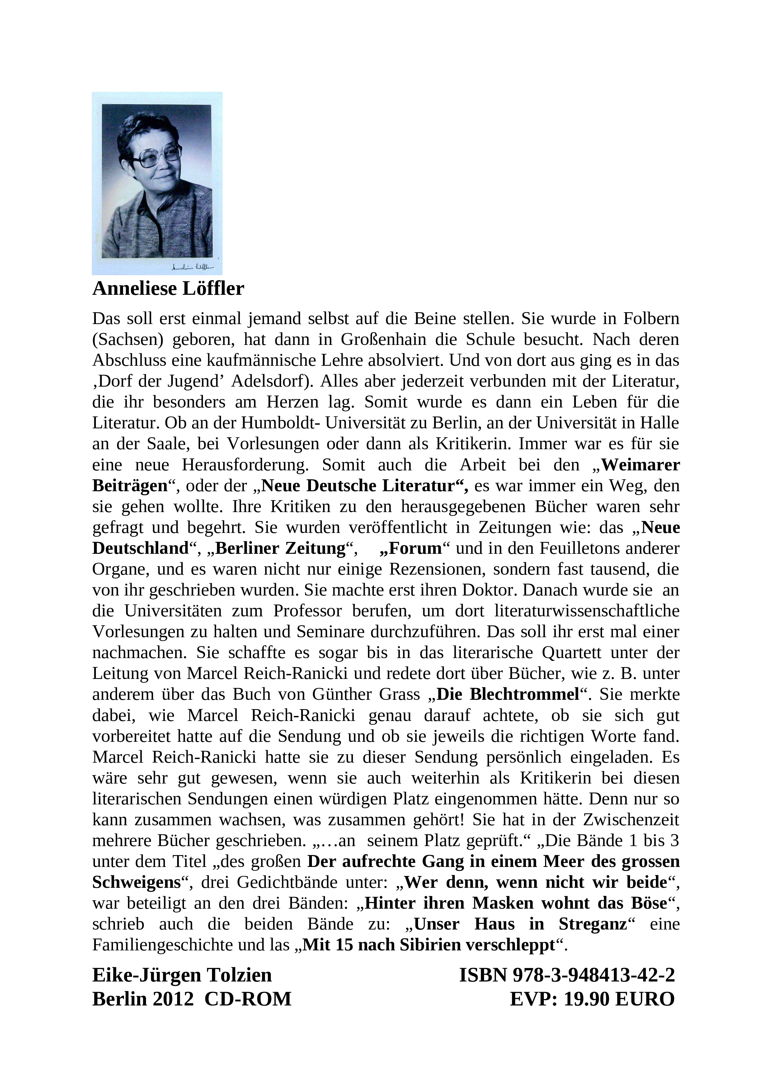 Das soll erst einmal jemand selbst aud die Beine stellen. Sie wurde in Folberg (Sachsen) geboren, hat dann in Großenhain die Schule besucht. Nach deren Abschluss hat sir eine kaufmännische Kehre absolviert. Und von dort aus ging sie in das "Dorf der Jugend" Adelsdorf. Alles aber jederzeit verbunden mit der Literatur, die ihr besonders am Herzen lag. Somit wurde es dann ein Leben für die Literatur. Ob an der Humboldt-Universität zu Berlin, an der Universität in Halle an der Saale, bei Vorlesungen oder dann als Kritikerin. Immer war es für sie eine Herausforderung, Somit auch die Arbeit bei den "Weimarer Beiträgen", oder der "Neue Deutsche Literatur", es war immer ein Weg, den sie gehen wollte. Ihre Kritiken zu den herausgegebenen Büchern waren sehr gefragt und begehrt. Sie wurden veröffentlicht in den Zeitungen qe das "Neue Deutschland"," Berliner Zeitung" , "Forum" und in den Feuiletons anderer Organe, und es waren nicht nur einige Rezensionen, sondern fast tausend, die von ihr geschrieben wurden. usw.