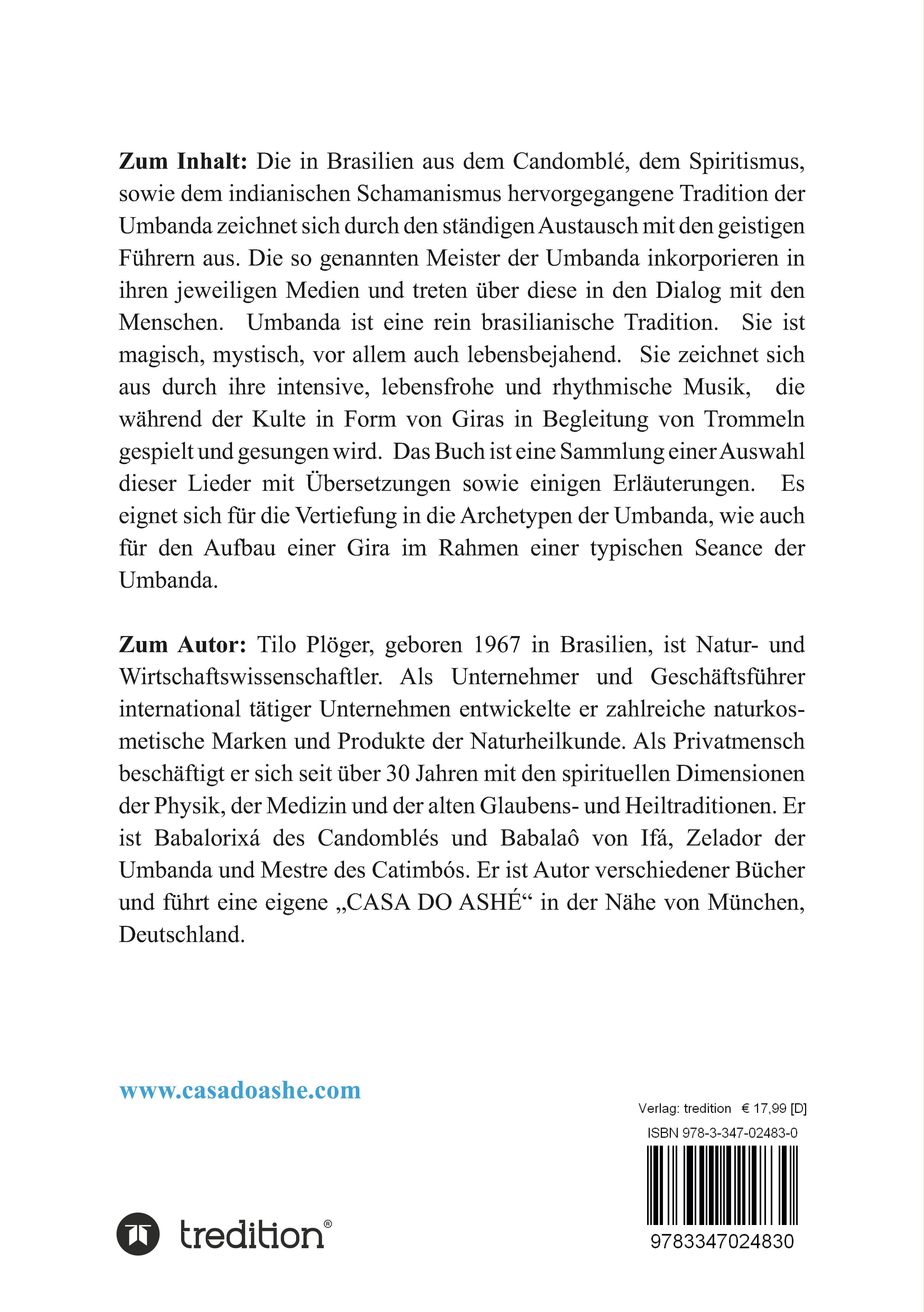 Die in Brasilien sehr verbreitete Tradition des Candomblés ist in Europa weitgehend unbekannt. Sie ist magisch, mystisch, lebensbejahend. Sie zeichnet sich aus durch ihre intensive, lebensfrohe und rhythmische Musik, die während der Kulte in Form so genannter Xirês in Begleitung von Trommeln gespielt und in der ursprünglichen afrikanischen Sprache Yorubá gesungen wird. Das Buch ist eine Sammlung einer Auswahl dieser Lieder mit Übersetzungen sowie einigen Erläuterungen. Es eignet sich für die Vertiefung in den Candomblé, wie auch für den Aufbau eines Xirês im Rahmen einer typischen Seance dieser Tradition. Das Buch steht im Zusammenhang mit weiteren Werken über die Mythen, die Organisation, die Rituale des Candomblés und des Ifismus, und umfasst auch Teile der kubanischen Santeria.