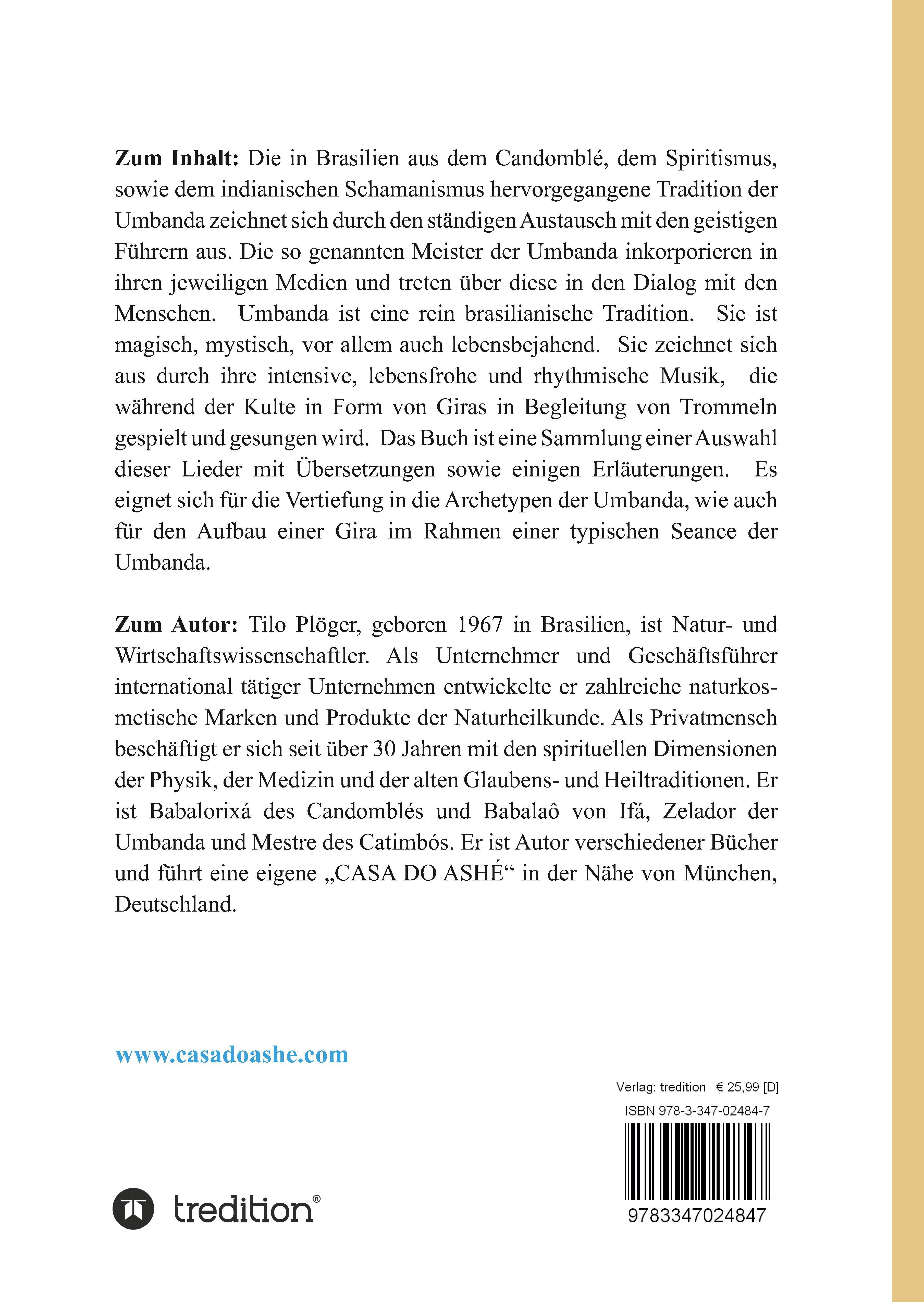Die in Brasilien sehr verbreitete Tradition des Candomblés ist in Europa weitgehend unbekannt. Sie ist magisch, mystisch, lebensbejahend. Sie zeichnet sich aus durch ihre intensive, lebensfrohe und rhythmische Musik, die während der Kulte in Form so genannter Xirês in Begleitung von Trommeln gespielt und in der ursprünglichen afrikanischen Sprache Yorubá gesungen wird. Das Buch ist eine Sammlung einer Auswahl dieser Lieder mit Übersetzungen sowie einigen Erläuterungen. Es eignet sich für die Vertiefung in den Candomblé, wie auch für den Aufbau eines Xirês im Rahmen einer typischen Seance dieser Tradition. Das Buch steht im Zusammenhang mit weiteren Werken über die Mythen, die Organisation, die Rituale des Candomblés und des Ifismus, und umfasst auch Teile der kubanischen Santeria.